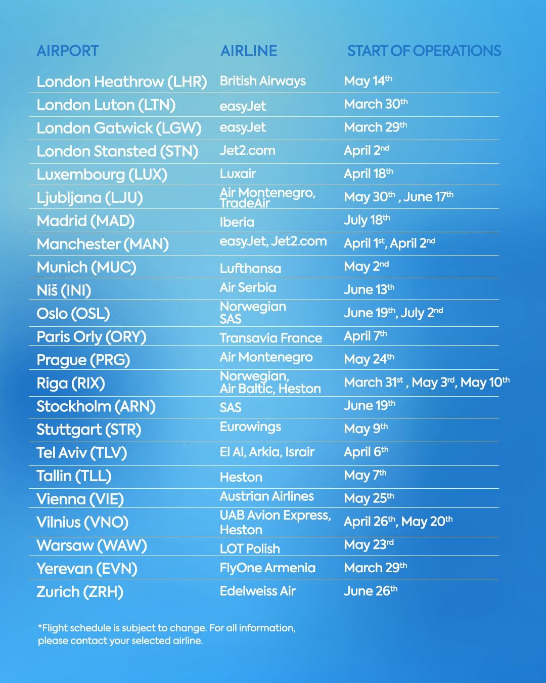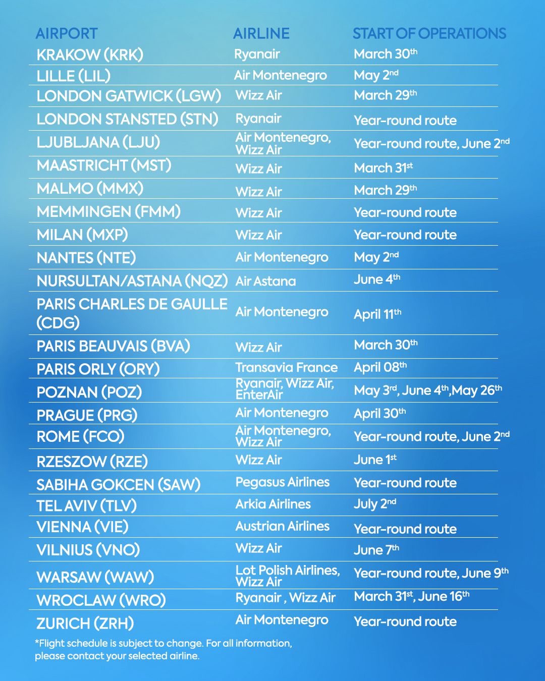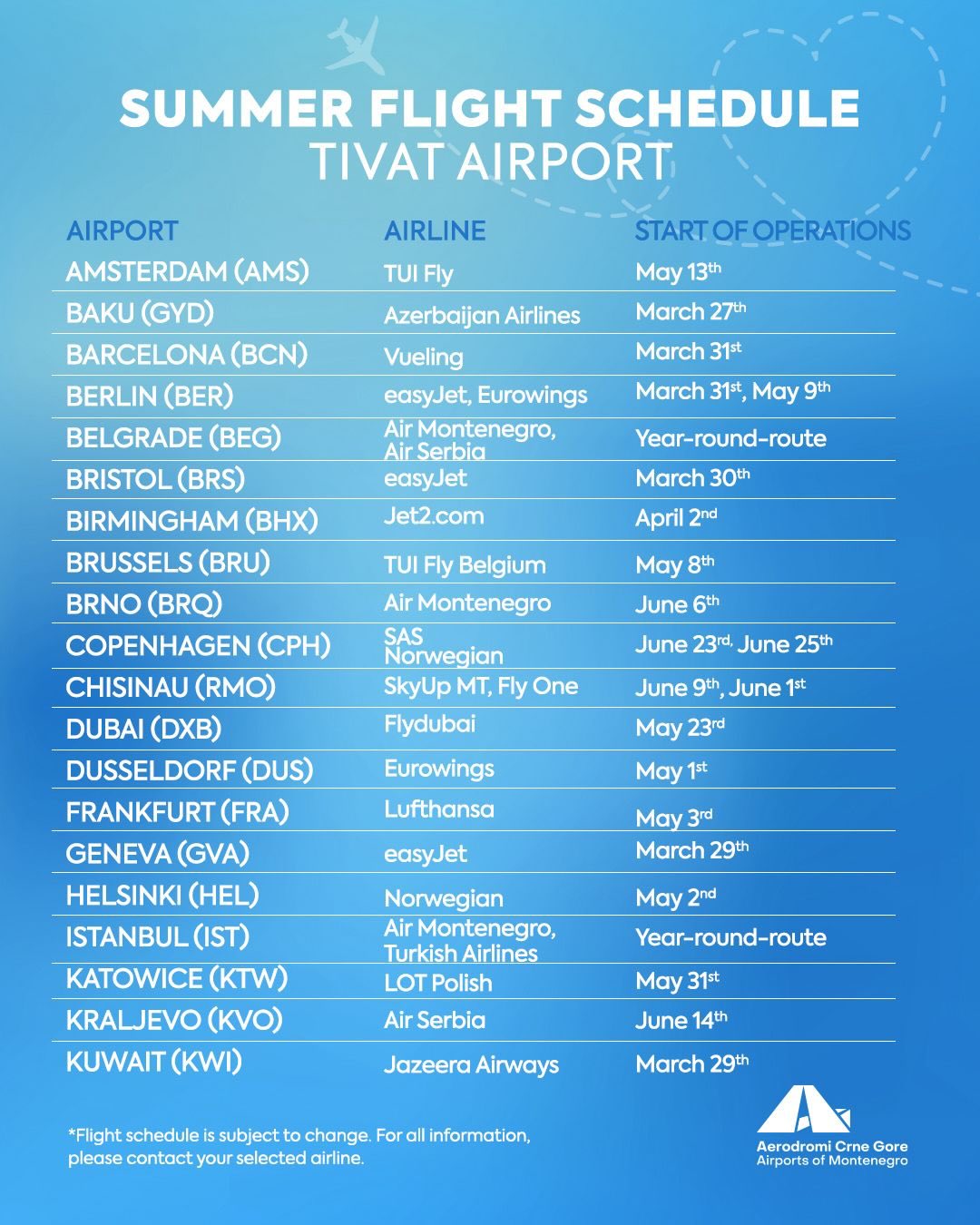 Aerodromi Crne Gore objavili su preliminarni ljetnji red letjenja za Aerodrom Podgorica i Aerodrom Tivat.
