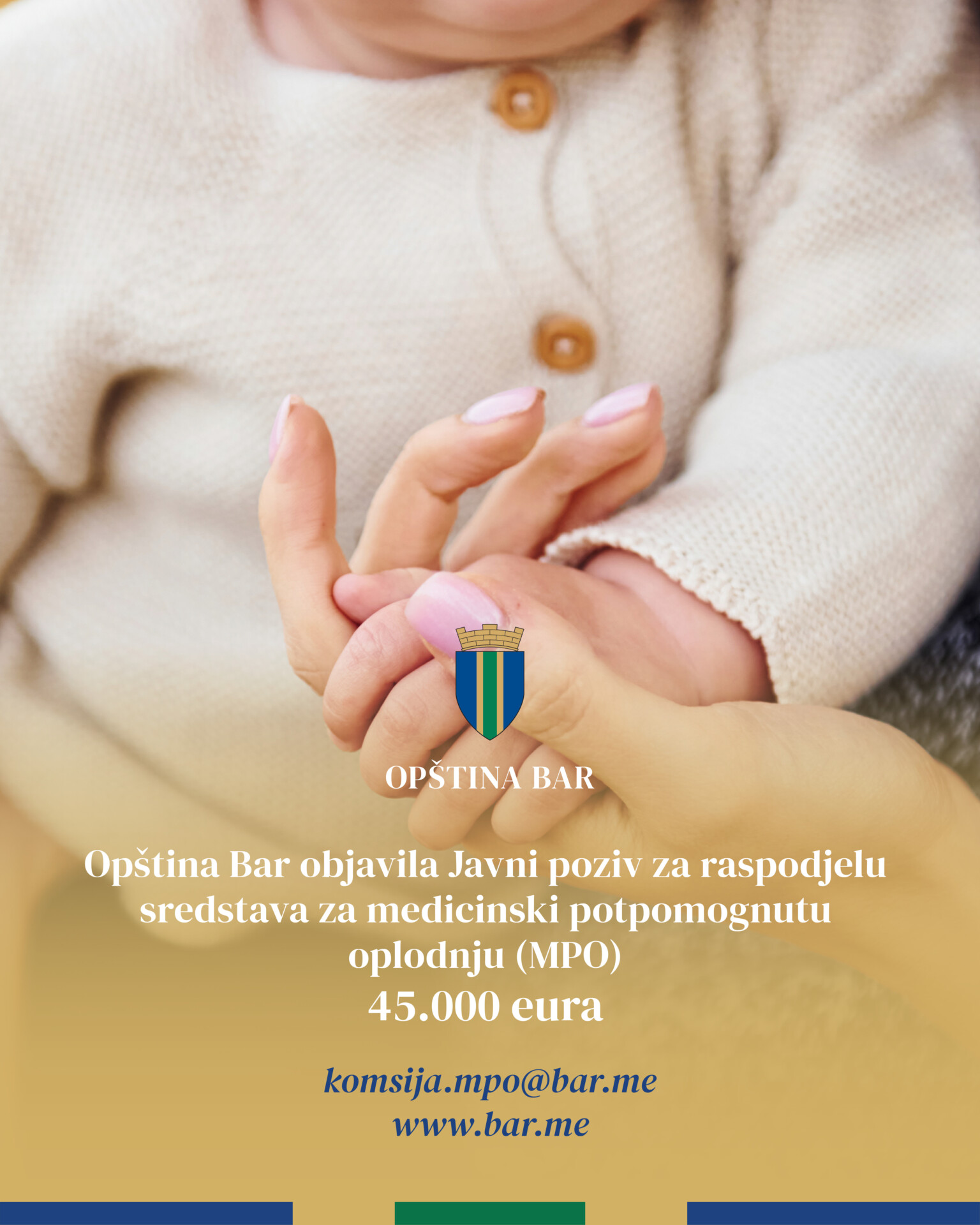 “Odlukom o raspodjeli sredstava za medicinski potpomognutu oplodnju (MPO), bespovratna novčana sredstva na ime naknade troškova u vezi sa ostvarivanjem prava na liječenje neplodnosti postupcima MPO dodijeljena su sredstva za ukupno 13 bračnih, odnosno vanbračnih parova, odnosno žena koje ne žive u bračnoj ili vanbračnoj zajednici sa prebivalištem u opštini Bar”, saopštenoje iz te opštine.
