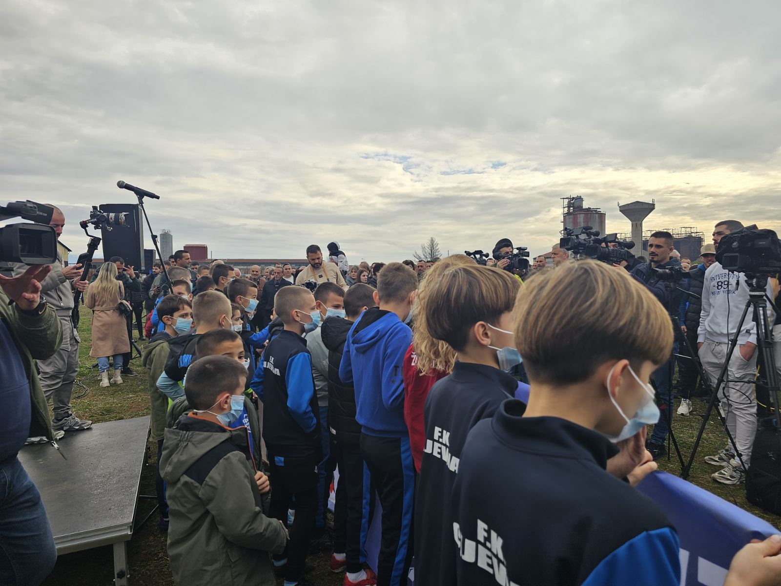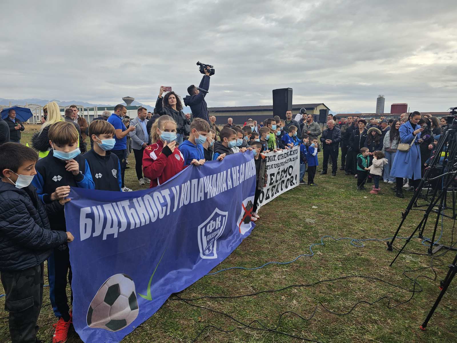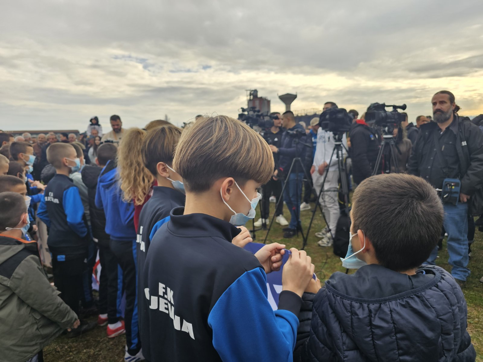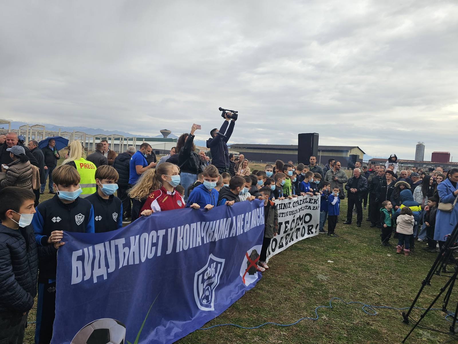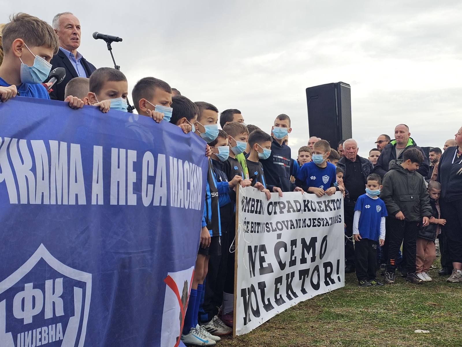 U Botunu se okupio i veliki broj djece u dresovima ,,Zete” koja nose transparent – ,,Kombinat, otpad, kolektor, neće biti ni uslova ni mjesta za nas – nećemo kolektor” i ,,budućnost u kopačkama, ne sa maskama”.
