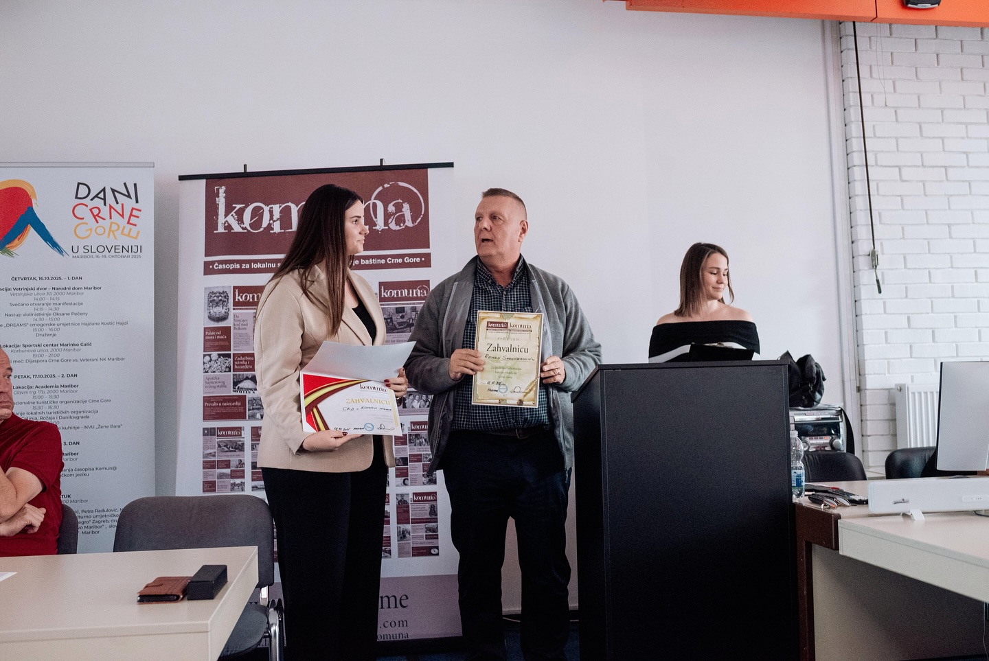 Na kraju promocije u ime redakcije i uredništva časopisa Komun@, Ramusović je uručio zahvalnicu i sve ukoričene brojeve časopisa kao znak saradnje i podrške zajedničkim projektima Nori Pavićević, sekretarki Crnogorskog kulturnog društva „Komovi“ Maribor, kao i Remzu Skenderoviću, za izuzetan doprinos u pripremi ovog broja časopisa.