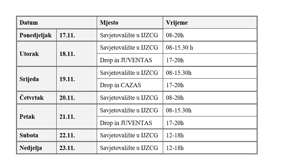 Institut za javno zdravlje Crne Gore i ove godine se pridružuje inicijativi, zajedno sa mrežom Savjetovališta za HIV u domovima zdravlja u Baru, Budvi, Beranama, Bijelom Polju, Nikšiću, Kotoru, Pljevljima i Herceg Novom, organizujući nedjeljnu akciju savjetovanja i testiranja.