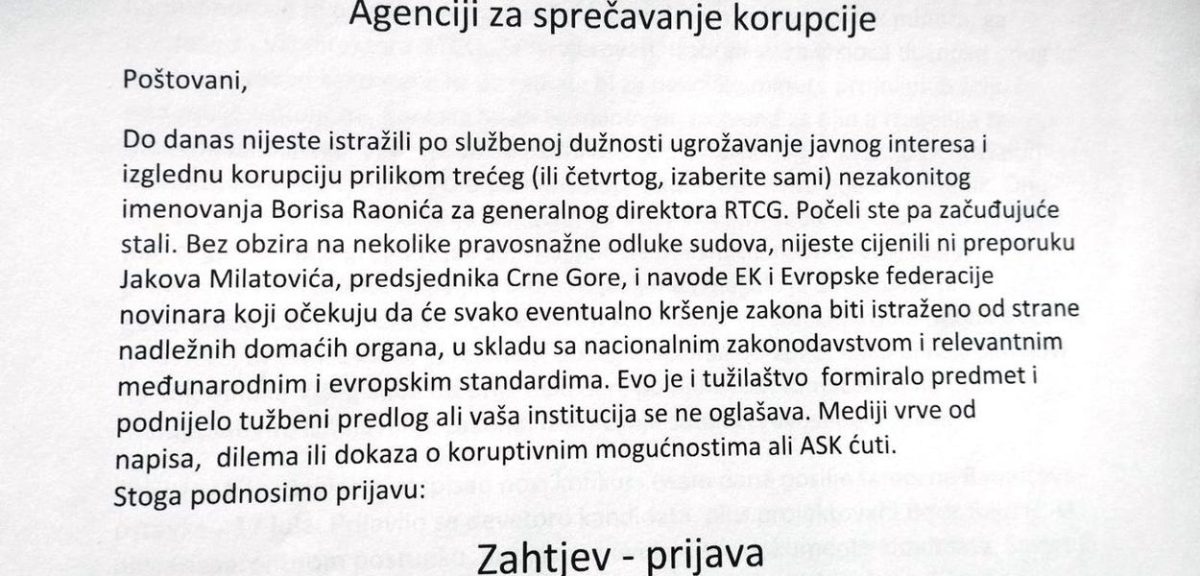 U prijavi, između ostalog, zahtijevaju da ASK ispita osnove sukoba interesa članova Savjeta RTCG koji su “ignorišući ranije preporuke Agencije, naočigled javnosti, kršeći propise, treći put,