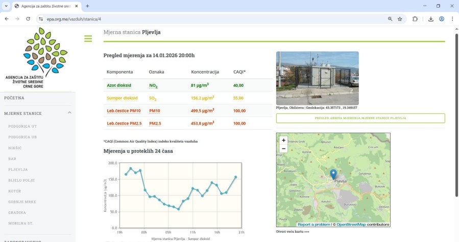 Veliko zagađenje bilježi i mobilna mjerna stanica u centru grada gdje je izmjereno 333,5 µg/m3 PM10 čestica i 309,3 µg/m3 PM2,5 čestica.