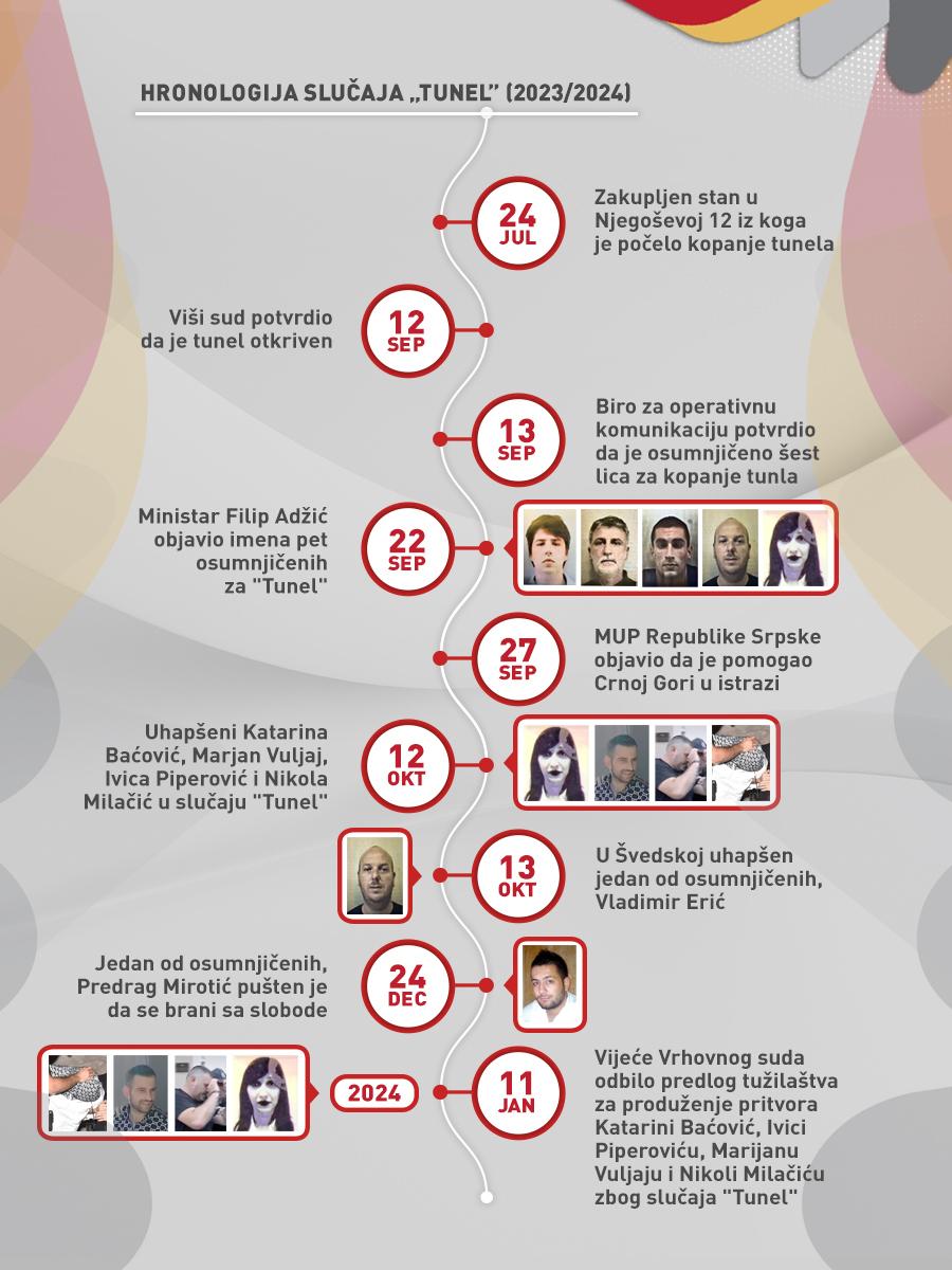 Osumnjičeni za umiješanost u obijanje depoa podgoričkog Višeg suda Katarina Baćović, Nikola Milačić, Ivica Piperović i Marijan Vuljaj, svi iz Crne Gore, pušteni su na slobodu 13. januara ove godine. Odlukom Vrhovnog suda Crne Gore odbijen je predlog tužilaštva da im se za slučaj “Tunel” produži pritvor.