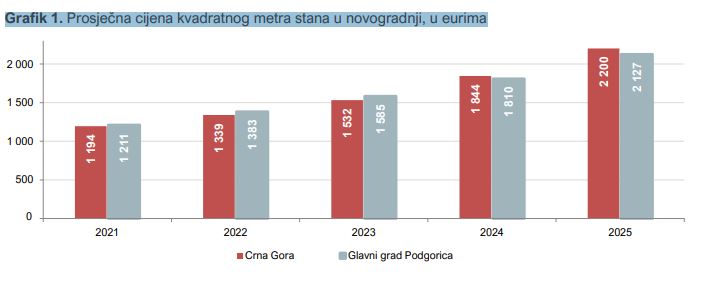 Podaci pokazuju konstantan rast cijena iz godine u godinu. U Crnoj Gori je prosječna cijena kvadrata porasla sa 1.339 eura u 2022, na 1.532 eura u 2023. i 1.844 eura u 2024, da bi u 2025. dostigla rekordnih 2.200 eura.