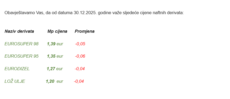 Sve vrste goriva naredne dvije sedmice biće jeftinije od ponoći, 30. decembra.