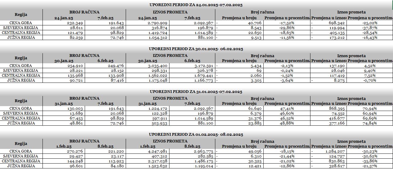 Podaci pokazuju i da su građani drugog dana bojkota-8.februara kupovali više nego prvog dana-7.februara. Tako je promet 7. februara iznosio 2.092.567 eura, dok je 8. februara promet iznosio 2.963.775 miliona eura.Podaci su pokazali i da su građani 6. februara pojurili u prodavnice kako se nakupovali ono što im je potrebno za naredna dva dana bojkota koja su najavljena, pa su tako trgovački lanci toga dana zabilježili 3.172.591 eura prometa.