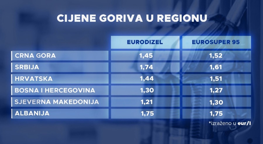 Tako je u Crnoj Gori veća cijena nego u Hrvatskoj, Bosni i Hercegovini i Sjevernoj Makedoniji, dok je nešto niža nego cijena goriva po litru u Srbiji i Albaniji.