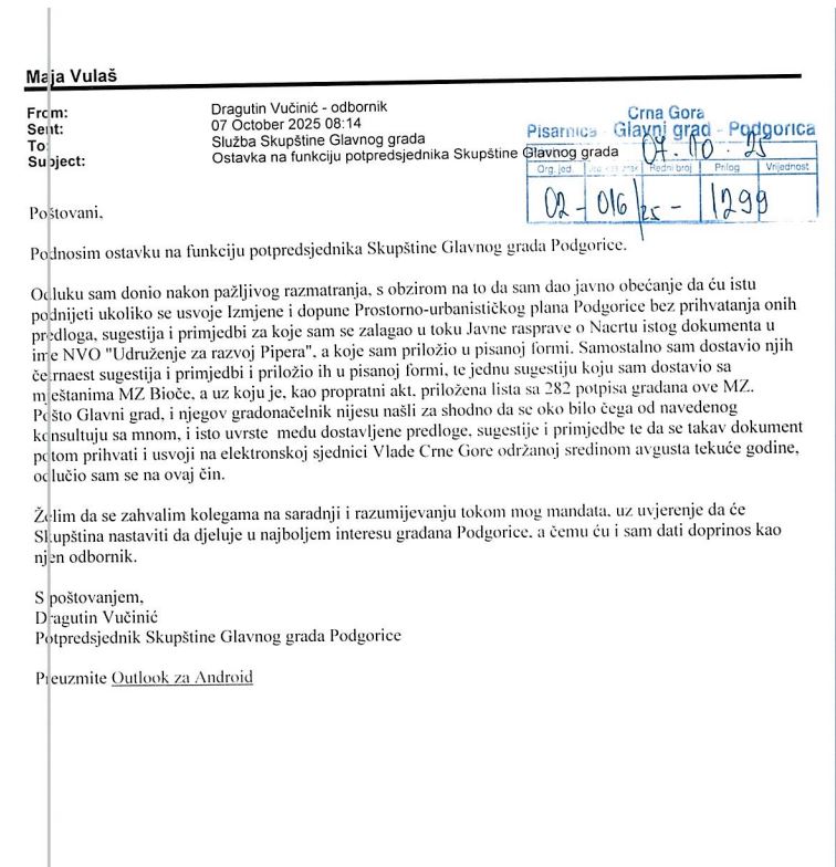 “Odluku sam donio nakon pažljivog razmatranja, s obzirom na to da sam dao javno obećanje da ću istu podnijeti ukoliko se usvoje Izmjene i dopune Prostorno-urbanističkog plana Podgorice bez prihvatanja onih predloga, sugestija i primjedbi za koje sam se zalagao u toku Javne rasprave o Nacrtu istog dokumenta u ime NVO “Udruženje za razvoj Pipera”, a koje sam priložio u pisanoj formi”, naglasio je.
