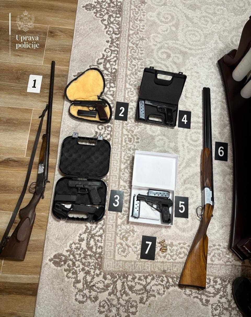 Takođe, policijski službenici su izvršili pretres kuće i pomoćnih objekata koje koriste E.P. (32) i M.P. (52) iz Ulcinja, kojom prilikom je pronađeno i oduzeto šest komada vatrenog oružja: četiri pištolja marki Glock, Browning i Zastava, kao i dvije lovačke puške marke Beretta i nepoznate marke, kao i više komada municije.