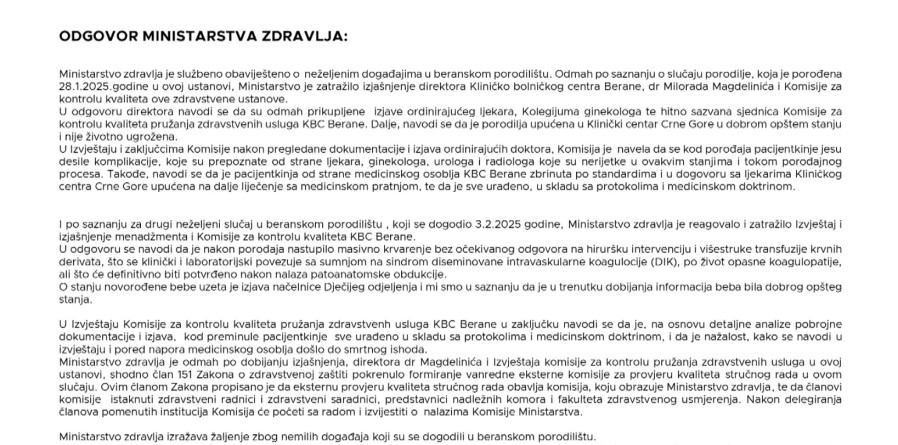 Napominju i da je od 2020. u Kliničko-bolničkom centru Berane bilo više od 4.700 porođaja i da do sada nije bilo smrtnih ishoda kod porodilja. Dodaju i da je zdravstveno-sanitarna inspekcija u novembru vršila kontrolu porodilišta gdje nisu ustanovljene nepravilnosti.