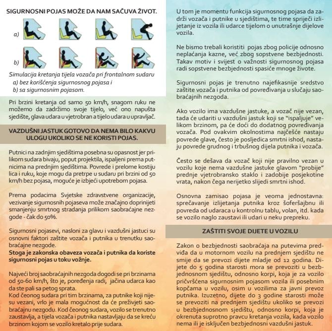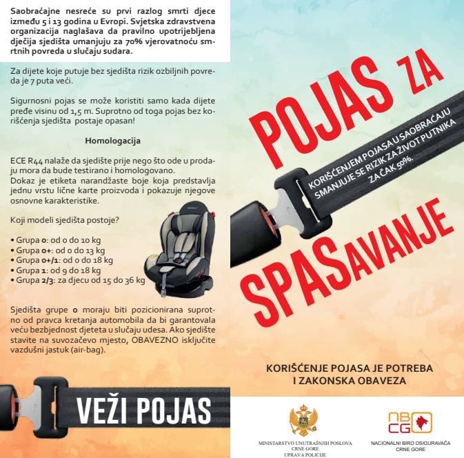 Kako su dodali, u okviru kampanje “Pojas za spas” biće realizovane preventivno-edukativne, ali i represivne aktivnosti, uključujući pojačane saobraćajne kontrole na teritoriji cijele države, ali i podjelu 10.000 flajera edukativno-informativnog karaktera.“Ističemo da zakonske odredbe preciziraju da svi vozači i putnici u vozilu koje ima fabrički ugrađene sigurnosne pojaseve – ili ima mogućnost njihove ugradnje – moraju koristiti pojaseve. Takođe, propisano je da se djeca do pet godina starosti moraju prevoziti u posebno dizajniranom bezbjednosnom sjedištu, odnosno u korpi čvrsto pričvršćenoj sigurnosnim pojasom ili kopčama unutar vozila, osim ako je riječ o javnom prevozu putnika”, pojasnili su.