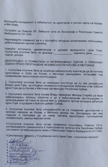 Skupština opštine Zeta sa žaljenjem konstatuje da su sve dosadašnje Vlade Crne Gore, od sticanja nezavisnosti, doprinijele nebrizi stanja građana Crne Gore, a čiji Kosovo i Metohija sastavni dio Republike Srbije.