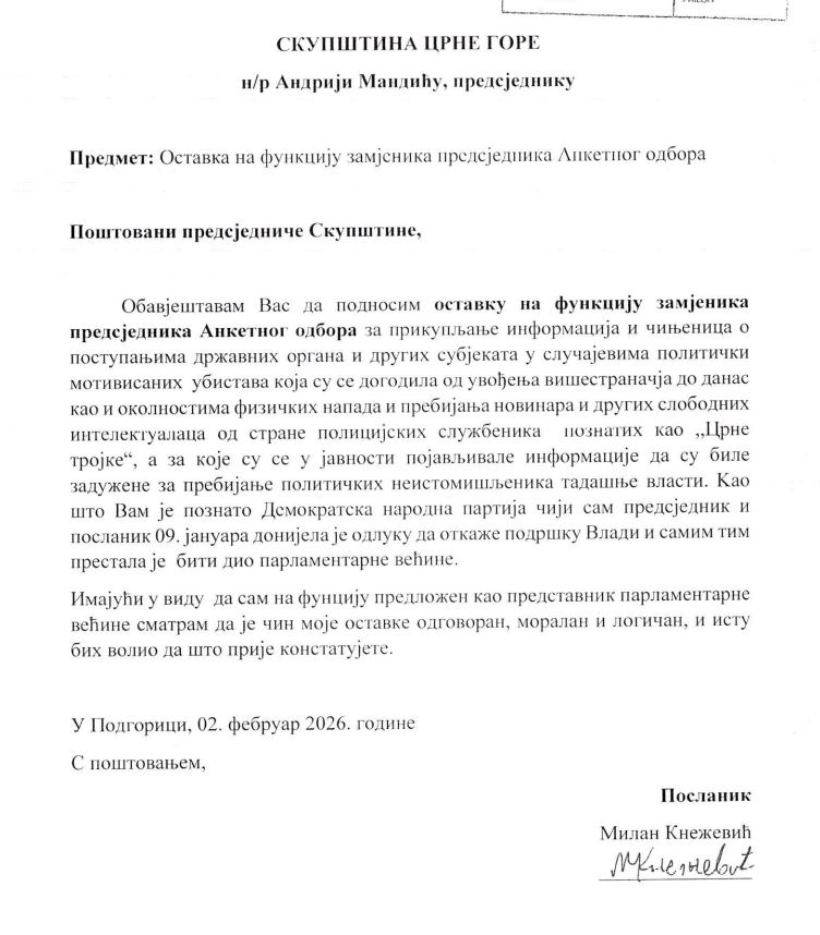 “Imajući u vidu da sam na funkciju predložen kao predstavnik parlamentarne većine, smatram da je moja ostavka odgovorna, moralna i logična“, naveo je Knežević, dodajući da nije želio da to konstatuju drugi, već da sam preuzme odgovornost
