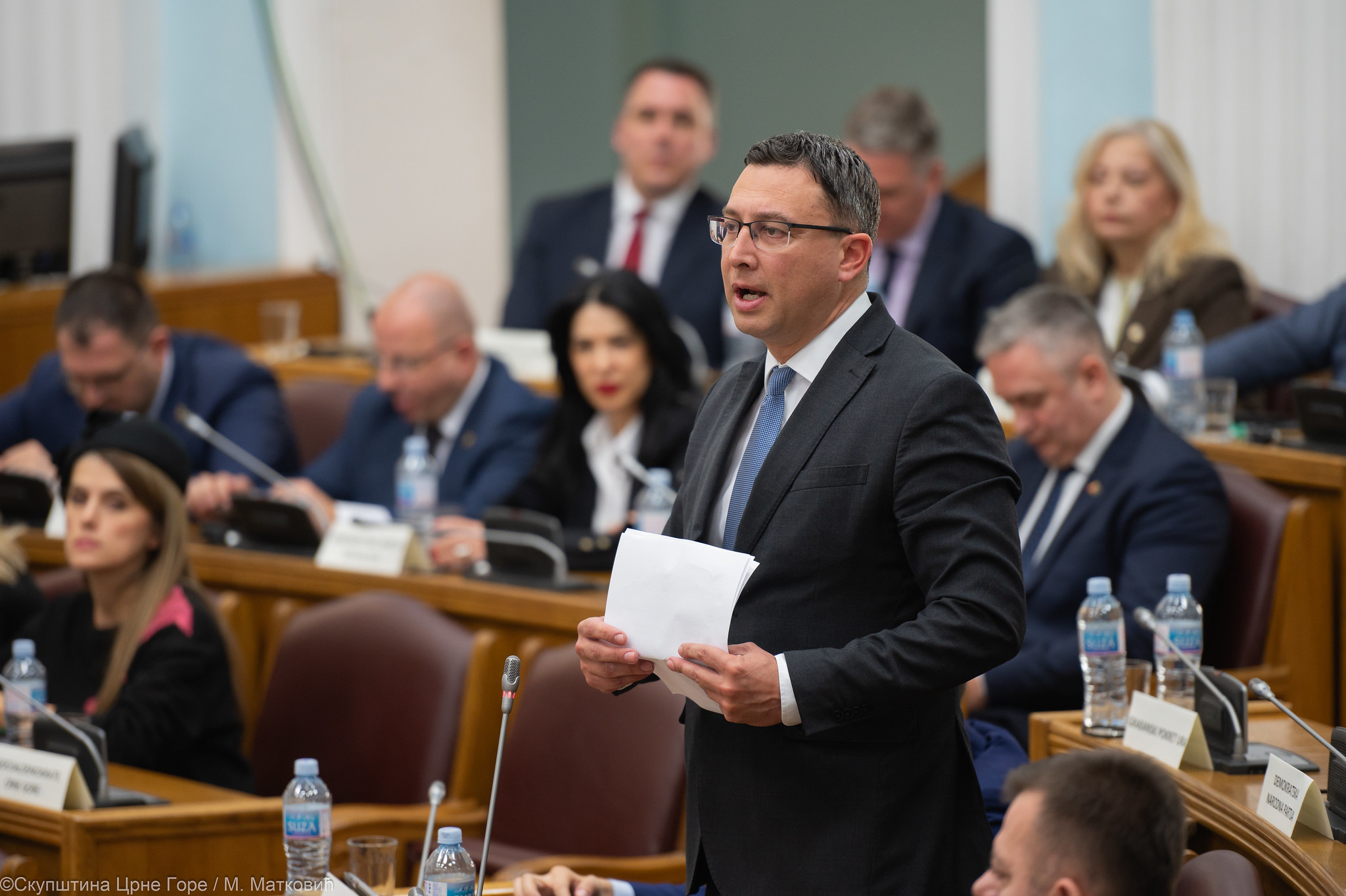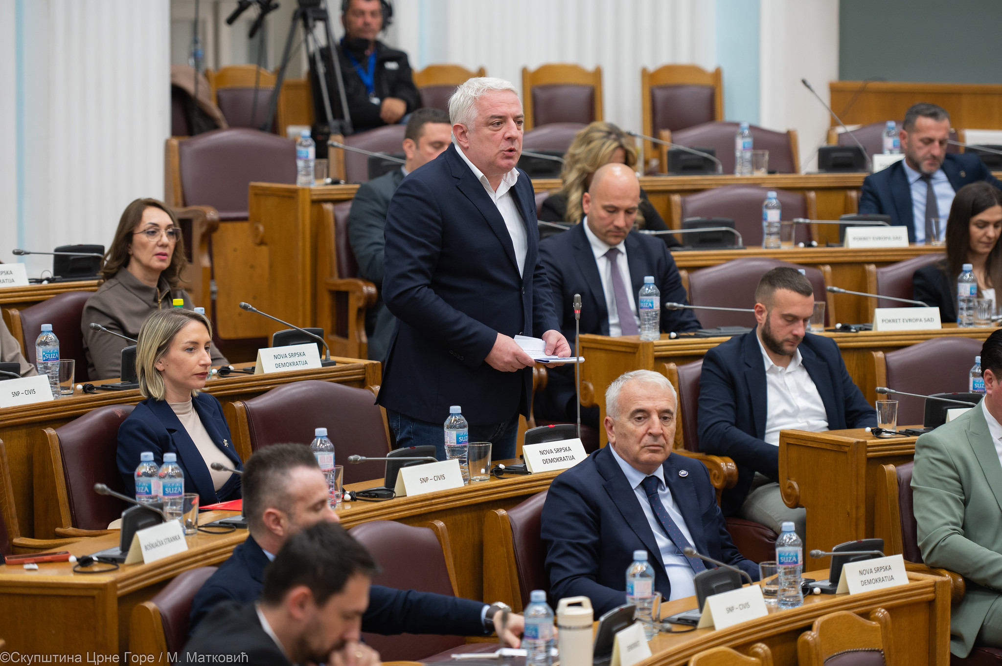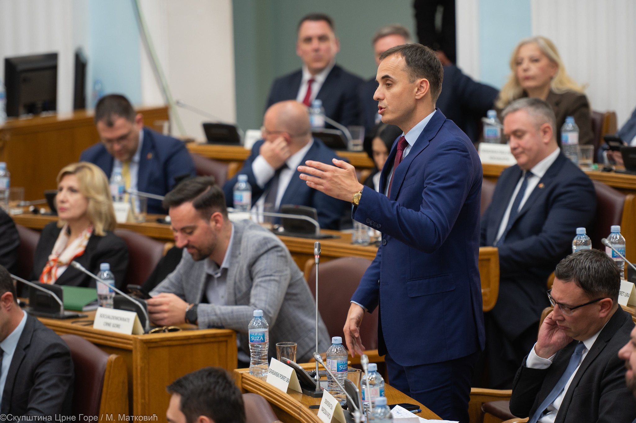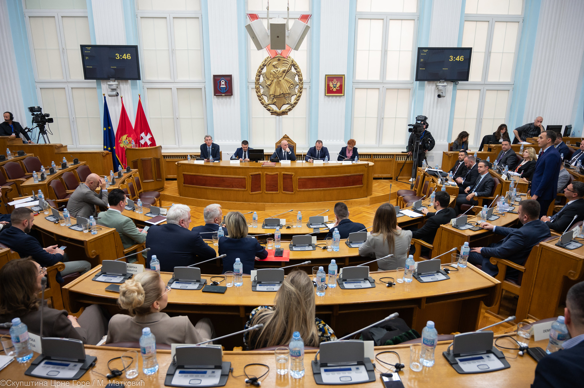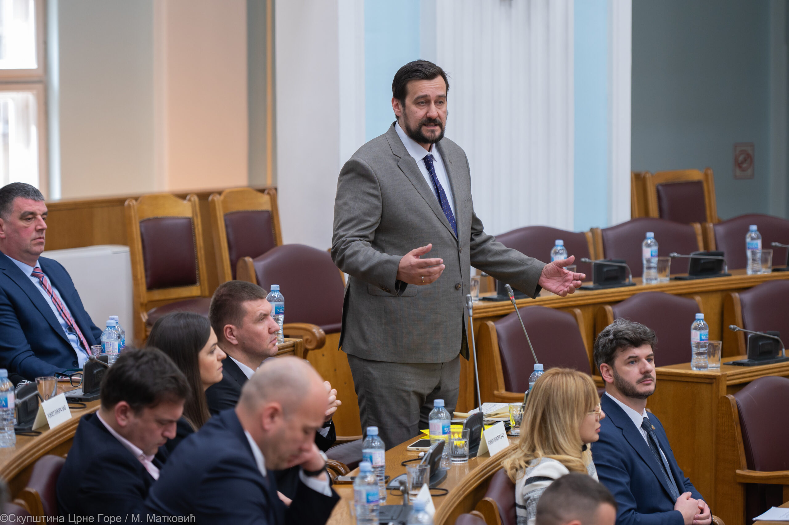 “Po Poslovniku nijedan od potpredsjednika ne može da predlaže tačke dnevnog reda, već to treba da radi predsjednik Skupštine (Andrija Mandić), koji je trebao da bude danas u sali. To što predsjednik Skupštine izbjegava da predsjedava na Cetinju – to govori o njemu”, rekao je Mugoša i dodao da ako na ovaj način sjednica bude nastavljena, zbog nepoštovanja Poslovnika, poslanici Evropskog saveza neće glasati za utvrđivanje dnevnog reda.