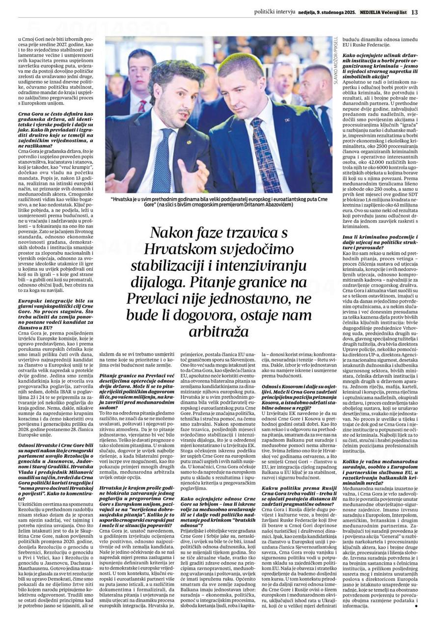 On je za Večernji list istakao da ,,nakon faze trzavica sa Hrvatskom svjedočimo stabilizaciji i intenziviranju dijaloga” i da ,,pitanje granice na Prevlaci nije jednostavno, ne bude li dogovora, ostaje nam arbitraža”.