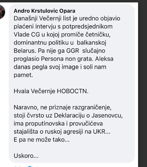 ,,Današnji Večernji list je uredno objavio plaćeni intervju sa potpredsjednikom Vlade Crne Gore u kojoj promoviše četničku, dominantnu poliriku u balkanskoj Belarus”, istakao je Opara.