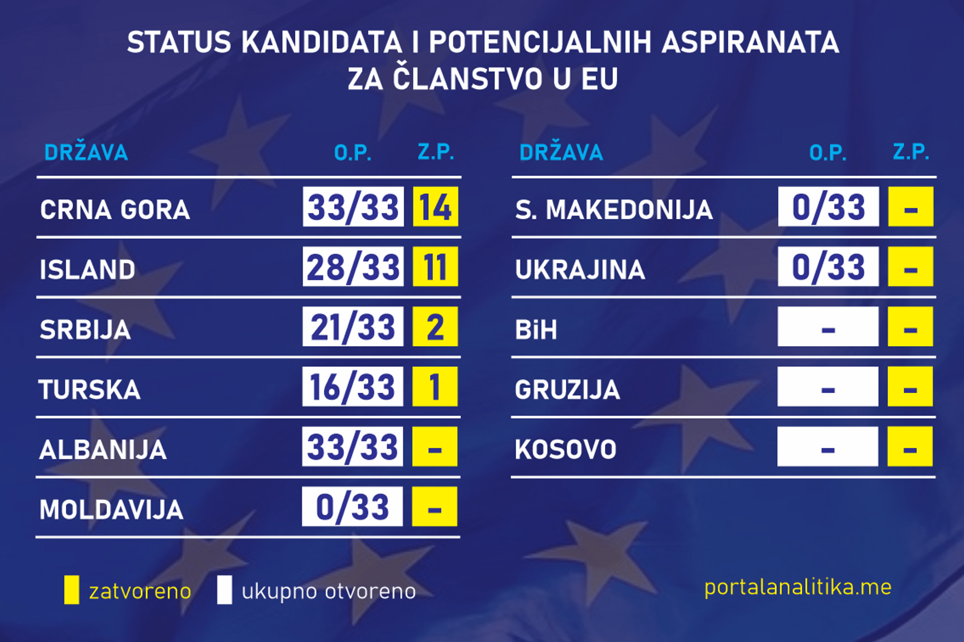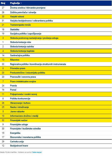 I najzad, za one kojima nijesu dovoljne samo brojke, u nastavku slijedi prikaz naziva svih pregovaračkih poglavlja, uz oznaku koja su u slučaju Crne Gore zatvorena, a koja i dalje imaju status otvorenih.