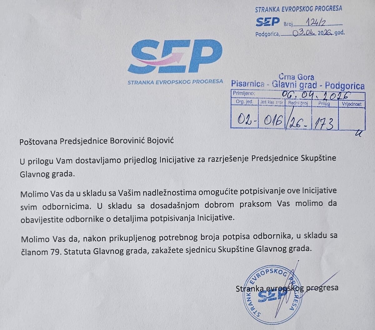 Stranka evropskog progresa (SEP) danas je predala Skupštini Glavnog grada Podgorice Prijedlog inicijative za razrješenje dr Jelene Borovinić Bojović dužnosti predsjednice Skupštine Glavnog grada Podgorice.