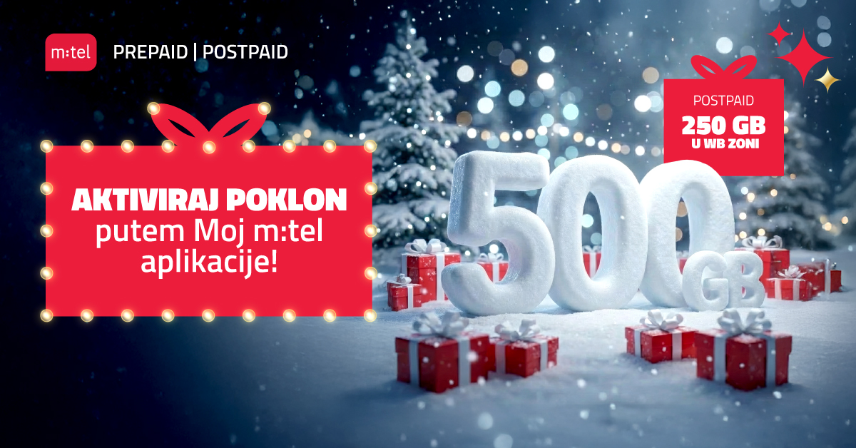 Praznici počinju prvim poklonom koji se daje iz srca, zbog čega MTEL poklanja 5oo GB interneta za saobraćaj u Crnoj Gori i zoni Zapadnog Balkana svim prepaid, postpaid i biznis korisnicima. Lijepa vijest je da postojeći postpaid korisnici mogu da iskoriste do 250 GB u WB zoni za video pozive, streaming i dijeljenje radosti. Aktivacija poklon internet dodatka, čija je validnost 15 dana, vrši se jednostavno – putem aplikacije Moj m:tel, u periodu od 5. 12. 2025. do 15. 1. 2026. godine.