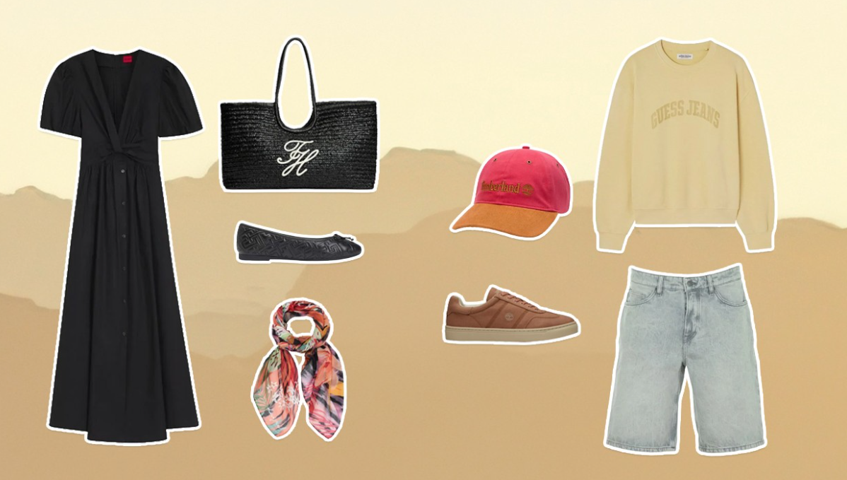 Midi haljina | HUGO ; Ženske baletanke | Tommy Hilfiger ; Ženska torba | Tommy Hilfiger Ženska marama | Desigual ; Muški duks | Guess ; Muški šorts | BOSS ; Muške patike | Timberland ; Muški kačket | Timberland