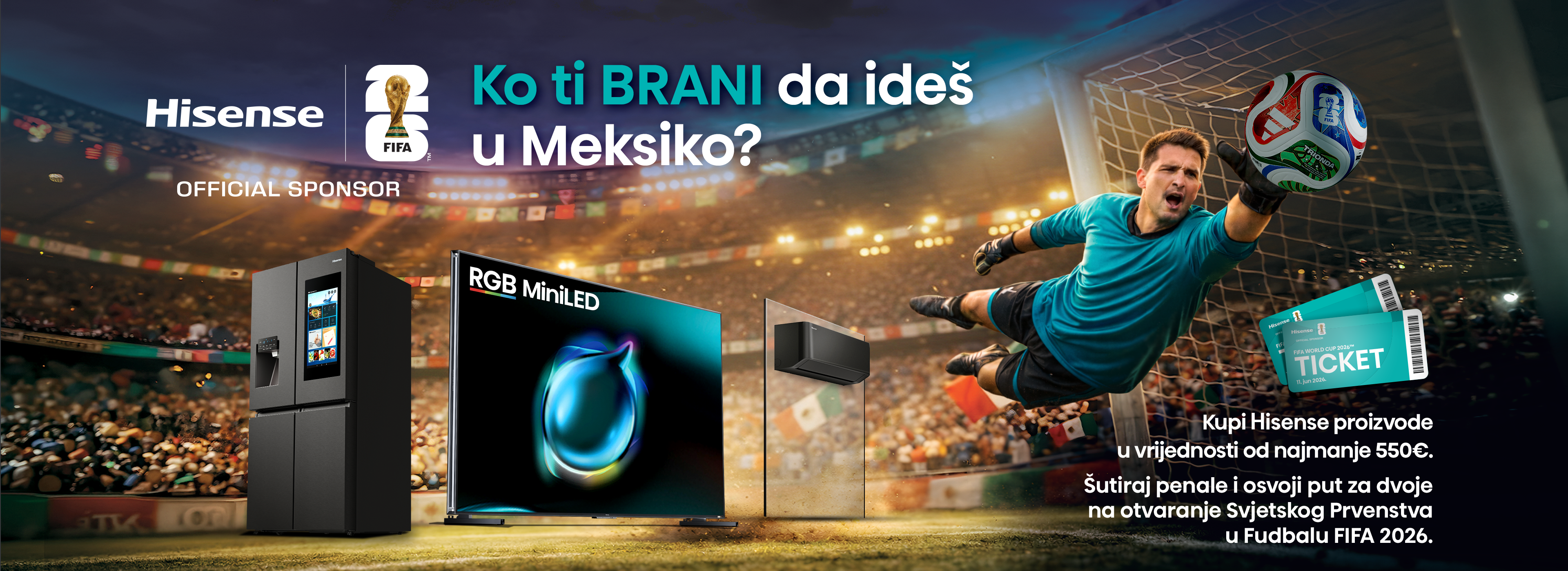 Hisense je i ove godine zvaničan sponzor FIFA World Cup 2026™ i zato svima daje priliku da odu na putovanje života i prisustvuju otvaranju Svjetskog prvenstva u Meksiku!