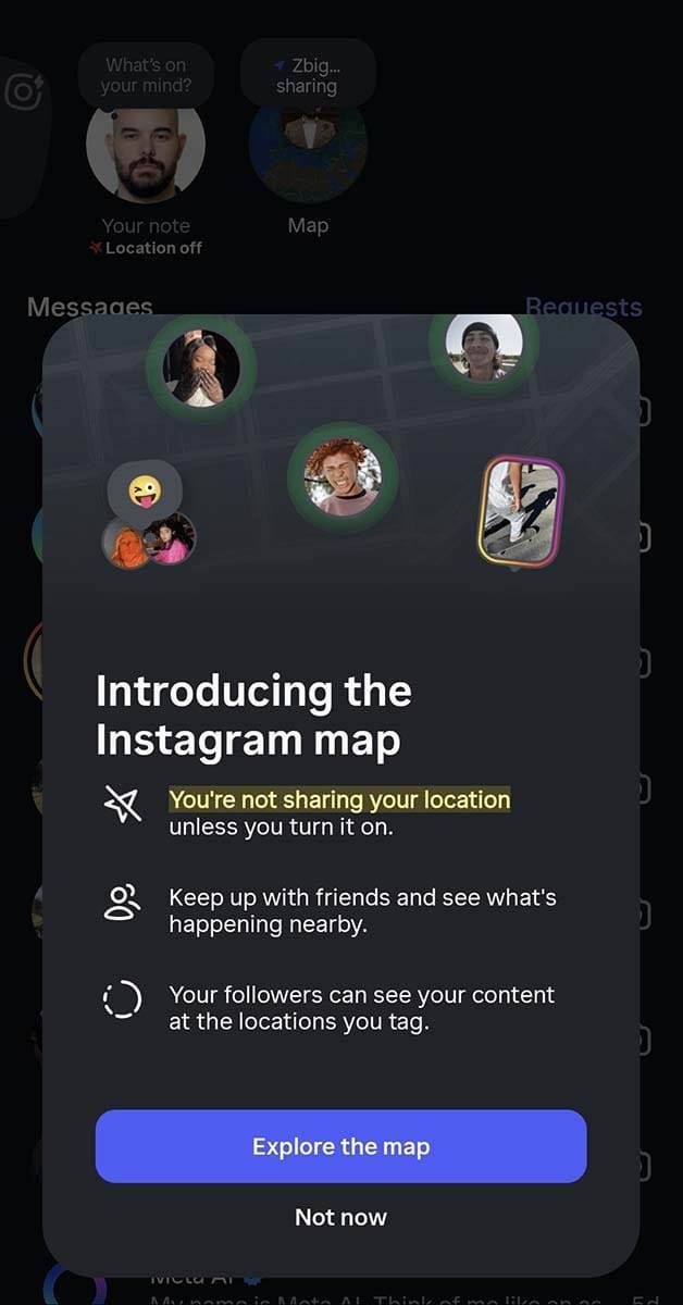 Instagram Map je funkcija kojoj pristupate iz svog DM inboksa. Nalazi se na vrhu, iznad konverzacija i odmah pored Notes objava, a njena ikonica jasno je označena imenom “Map”.
