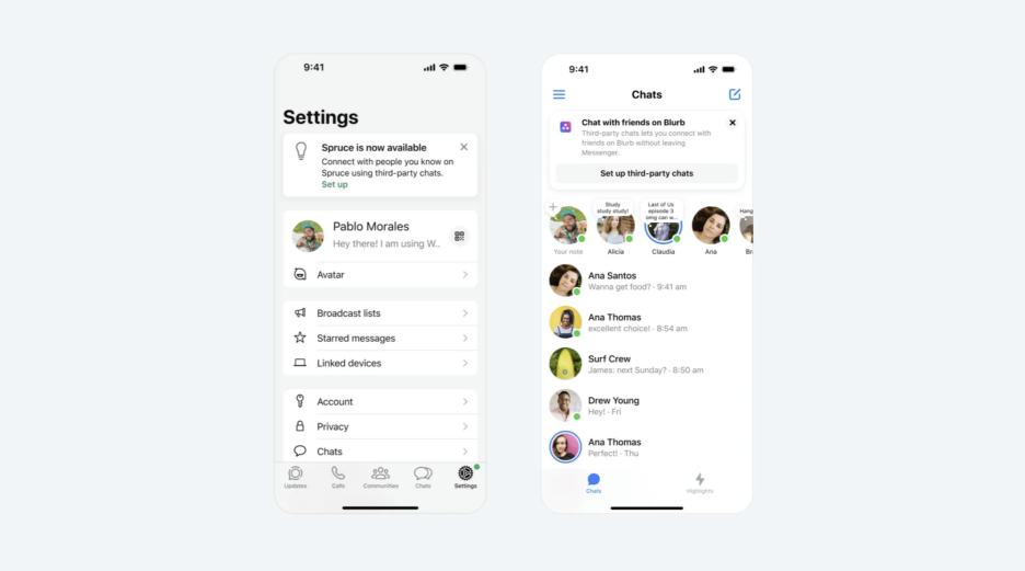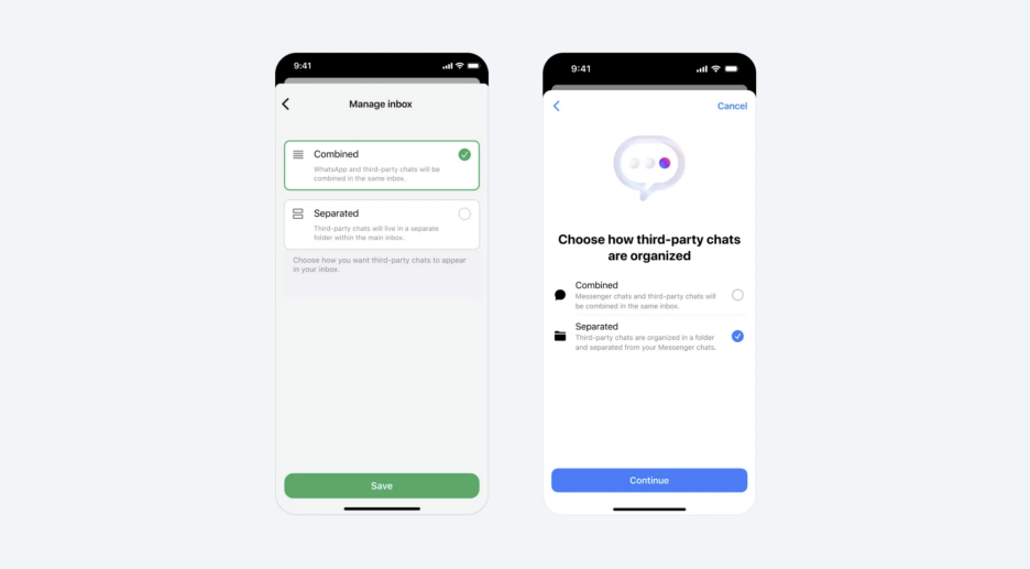 U septembru je Meta nagovijestila kako će izgledati integracija trećih strana s WhatsApp-om i Messenger-om. Važno je napomenuti da će korisnicima biti ponuđen izbor primanja poruka trećih strana u zasebnoj mapi ili kombinovanom inboxu. Meta je takođe najavila da će podsjećati korisnike “svaki put kada nova aplikacija za razmjenu poruka treće strane postane dostupna”.