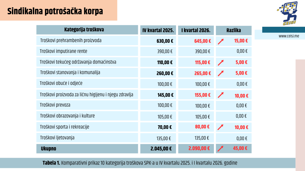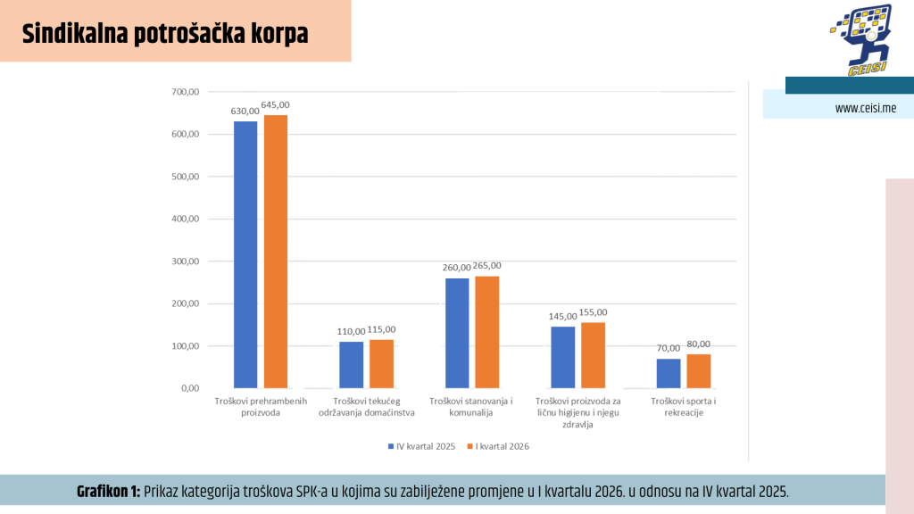 Na osnovu prikupljenih cijena za 136 prehrambenih namirnica iz tri najveća trgovinska lanca u Crnoj Gori (od ukupno 139, uzimajući u obzir sezonski karakter pojedinih proizvoda), iz Unije slobodnih sindikata je utvrđeno da trošak za prehrambene proizvode u I kvartalu 2026. godine iznosi 645,00 eura. U poređenju sa IV kvartalom 2025, kada je ova kategorija troškova iznosila 630,00 eura, evidentiran je rast od 15,00 eura, što predstavlja povećanje od 2,38 posto.