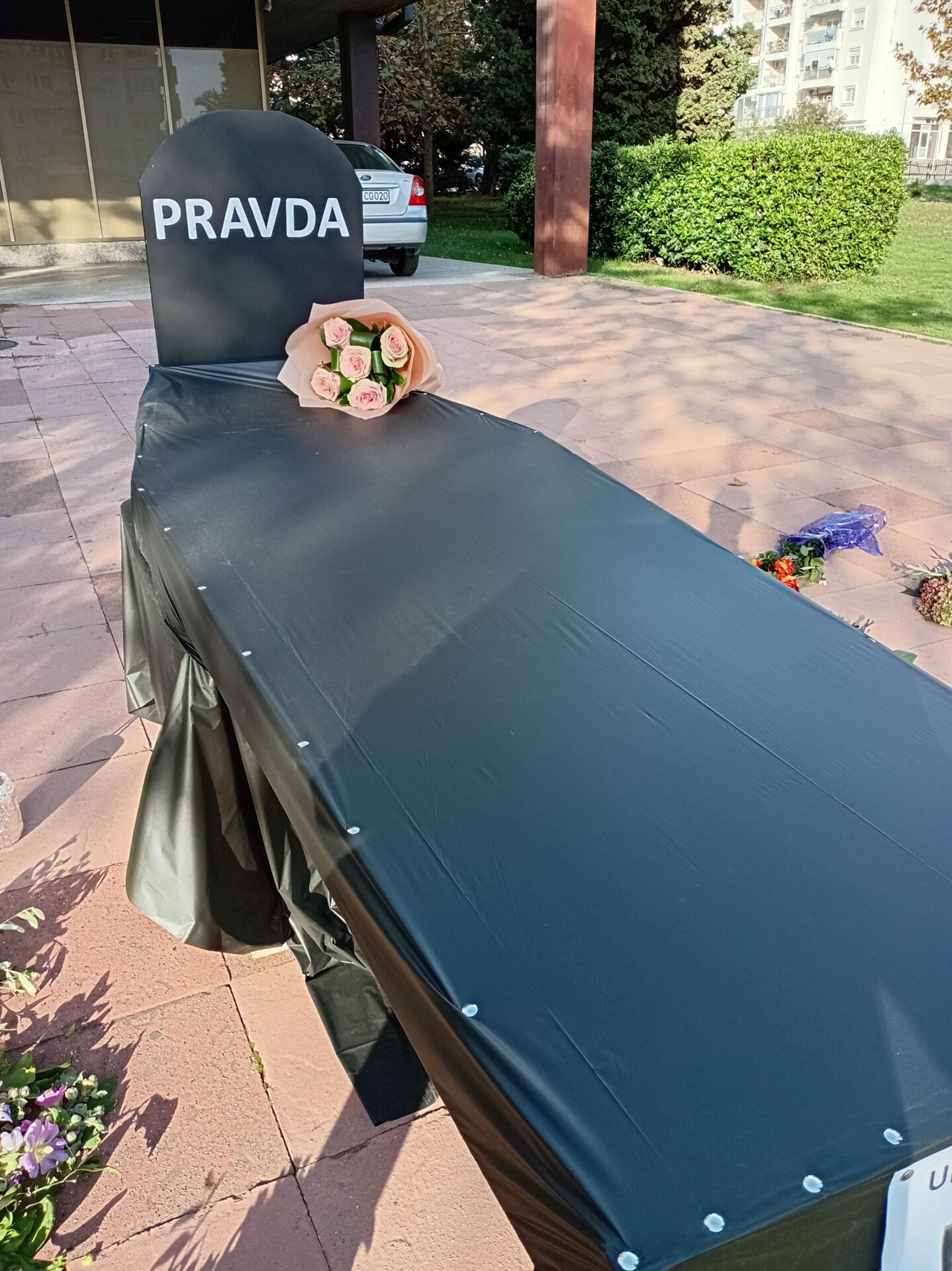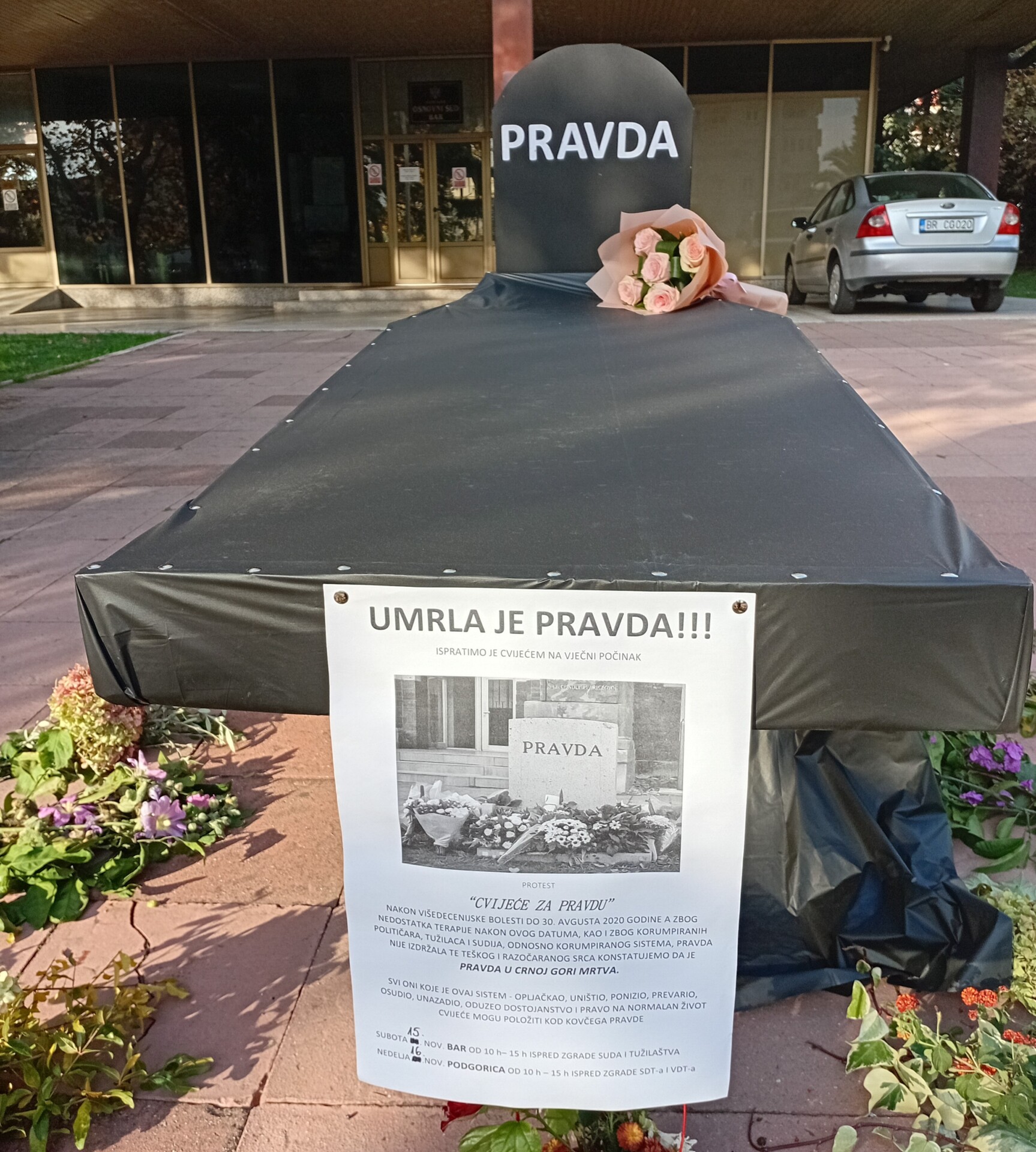 Bivši radnici Primorke održali su danas protestni performans ispred Osnovnog državnog tužilaštva i Osnovnog suda u Baru, gdje su ispred instalacije “kovčega pravde” polagali cvijeće, u znak nezadovoljstva prema postupanju pravosudnih organa u Crnoj Gori.