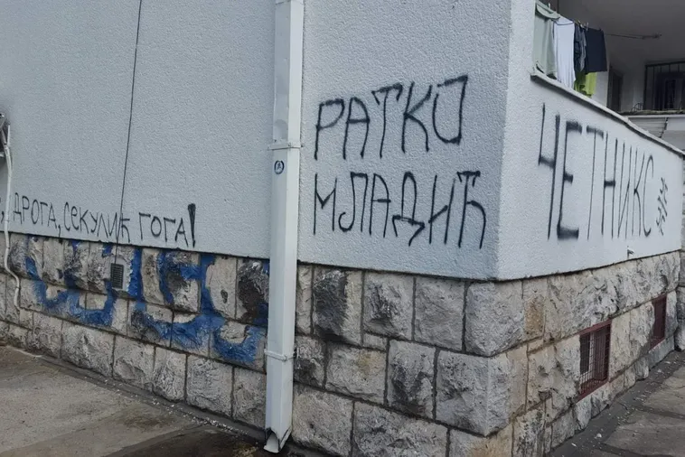 Tek ofarbana fasada je iscrtana grafitima “Đurišiću mlad majore”, “Ratko Mladić”,”Četniks”…