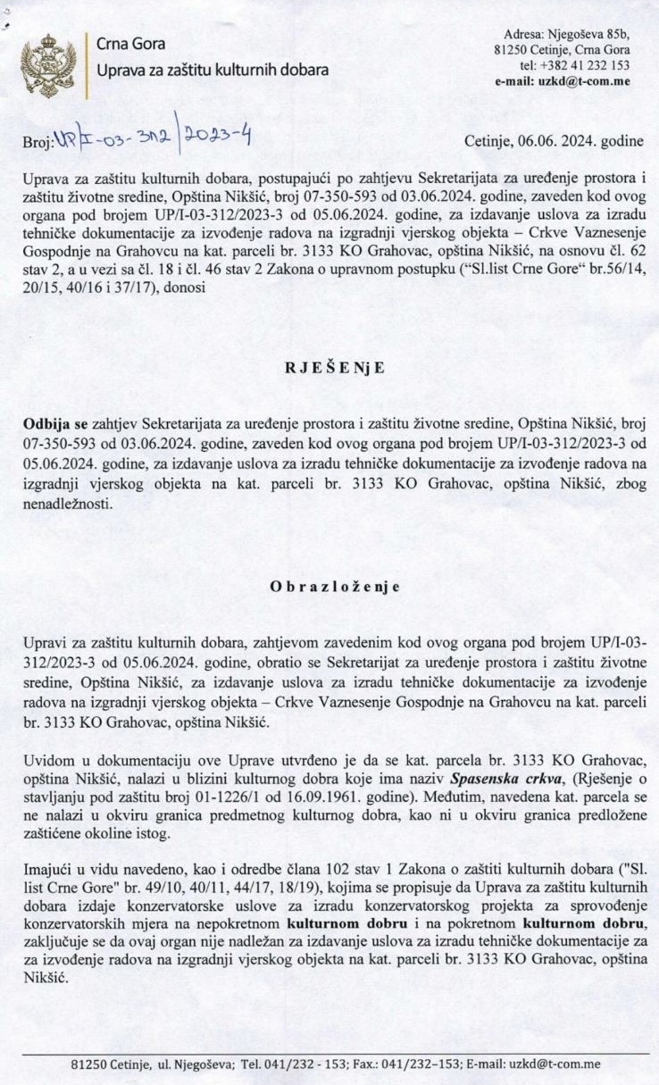 „Crkva Srbije na Grahovcu planira izgradnju crkve ‘Vaznesenje Gospodnje’ kao da postojeći objekat pod tim nazivom ne postoji“, saopštili su iz CGP-a.