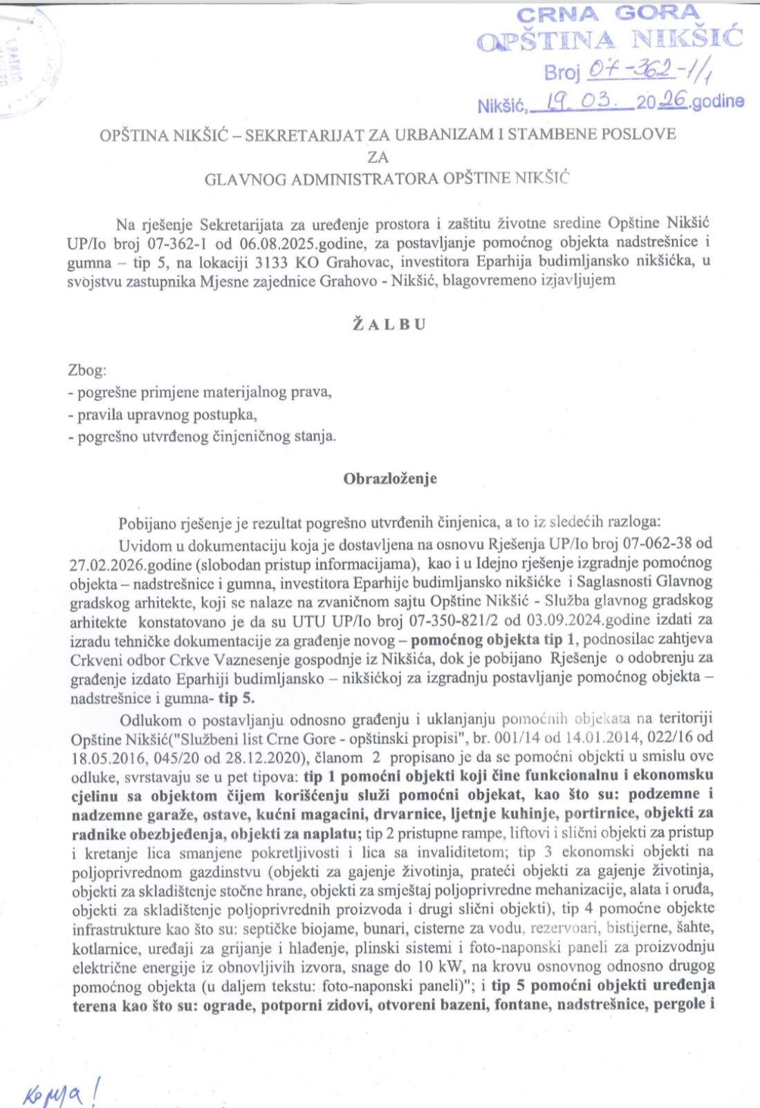 Crkva Srbije je predala zahtjev za izgradnju pomoćnog objekta ‘TIP 1’, a zatim dobila rješenje kojim se odobrava gradnja objekta ‘TIP 5’. To je i predmet jedne od naših žalbi“, istakli suiz CGP-a