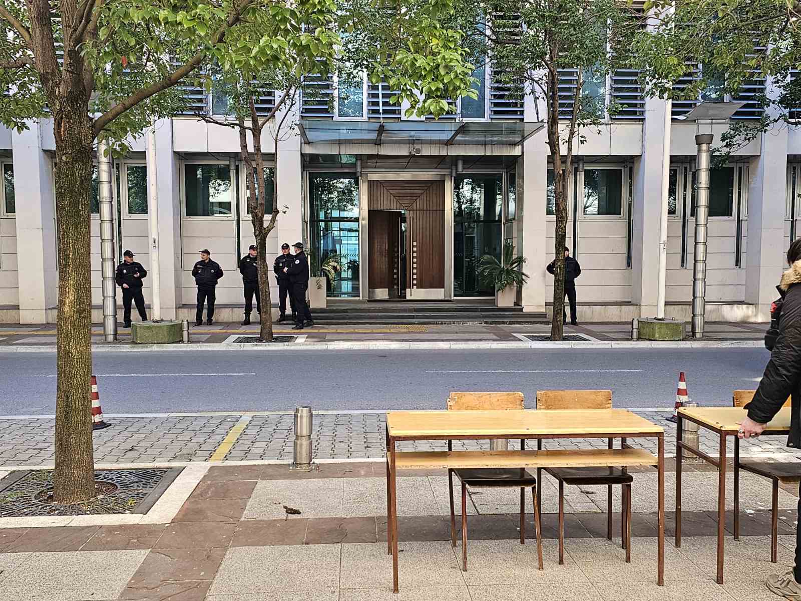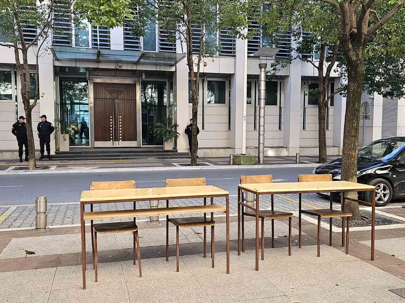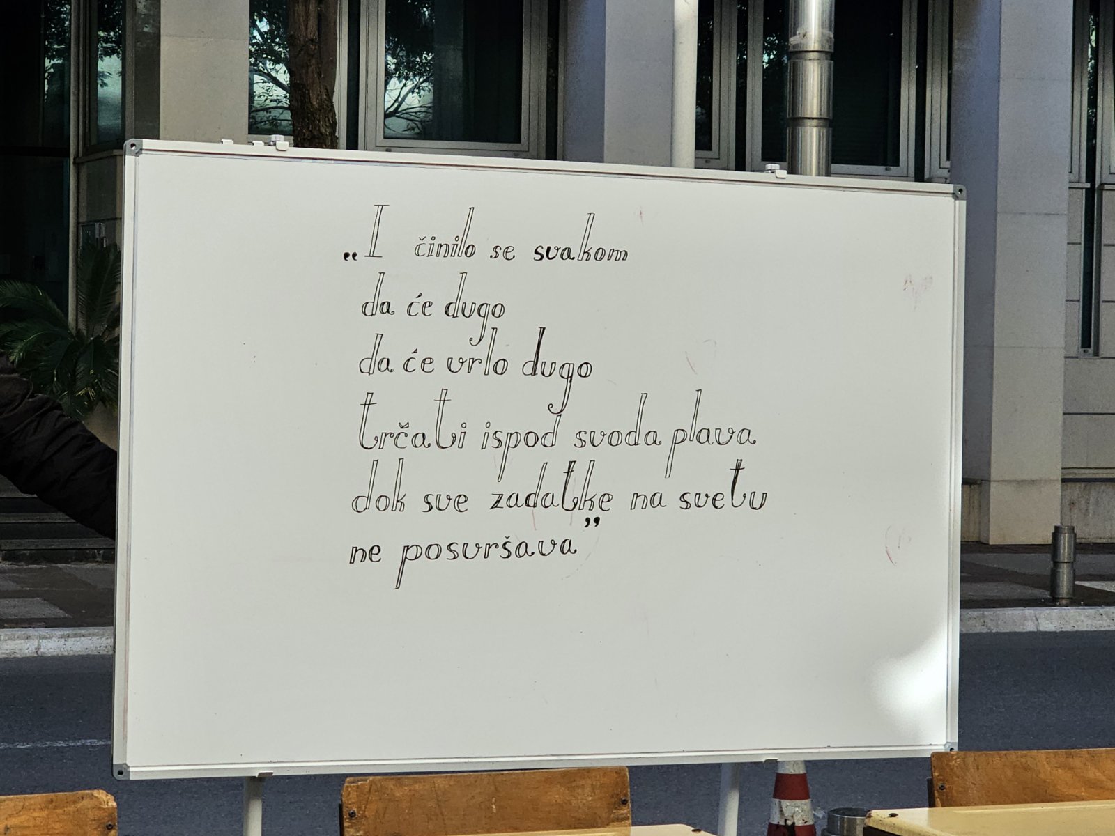 Studenti su preko puta ulaza u Vladu postavili školske klupe i poruku sa stihovima: