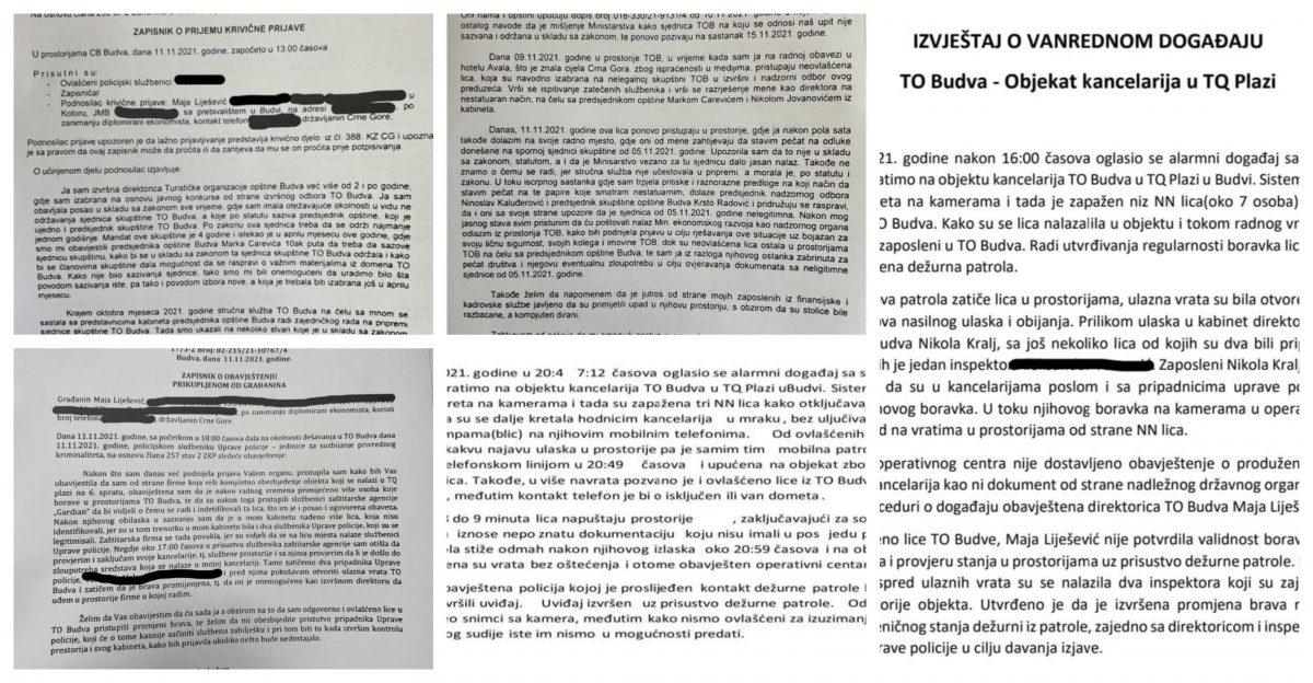 Pored toga, istog dana obaviještena sam od strane zaštitarske firme koja vrši zaštitu prostorija TO Budva u TQ Plazi da se u popodnevnim časovima nakon završetka radnog vremena, u prostorijama nalazi više lica, kada i dolazi do nasilnog mijenjana brava na vratima, što je takođe prijavljeno Centru bezbjednosti Budva.