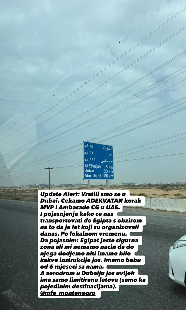 „Vratili smo se u Dubai. Čekamo adekvatan korak MVP i Ambasade CG u UAE. I pojašnjenje kako će nas transportovati do Egipta s obzirom na to da je let koji su organizovali danas, po lokalnom vremenu. Da pojasnim: Egipat jeste sigurna zona, ali mi nemamo način da do njega dođemo, niti imamo bilo kakve instrukcije još. Imamo bebu od šest mjeseci sa nama“, navela je Šebek.