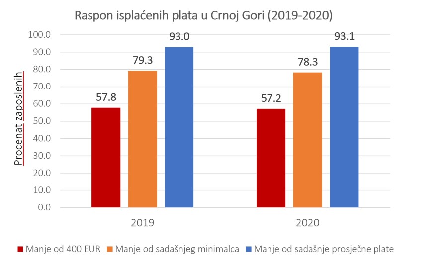 “U decembru 2019. godine, 107 od ukupno 186 hiljada zaposlenih ili 57,8 odsto, primalo je zaradu manju od 400 eura, što je iznos koji je za 50 eura niži od minimalne zarade po programu Evropa sad 1 i od trenutne minimalne penzije. Među njima, 36 hiljada građana radilo je za minimalnu ili nižu netto zaradu koja je tada iznosila 222 eura”, pokazuju podaci Poreske uprave (PU), saopšteni Portalu RTCG.