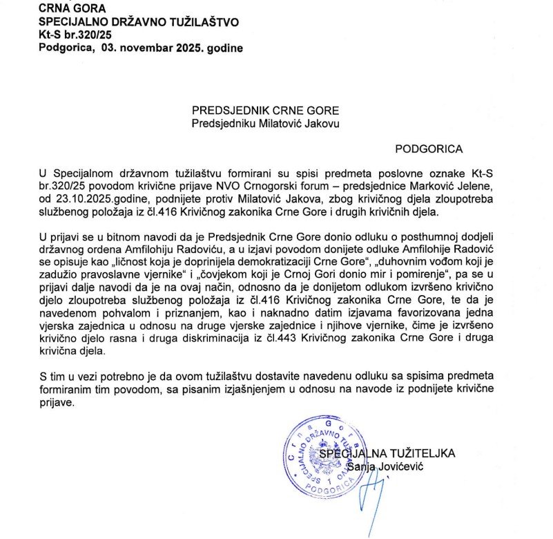 Marković smatra da je Milatović favorizovao jednu vjersku zajednicu.“S tim u vezi potrebno je da ovom tužilaštvu dostavite navedenu odluku sa spisima predmeta formiranim tim povodom, sa pisanim izjašnjenjem u odnosu na navode iz podnijete krivične prijave”, navela je specijalna tužiteljka Sanja Jovićević.
