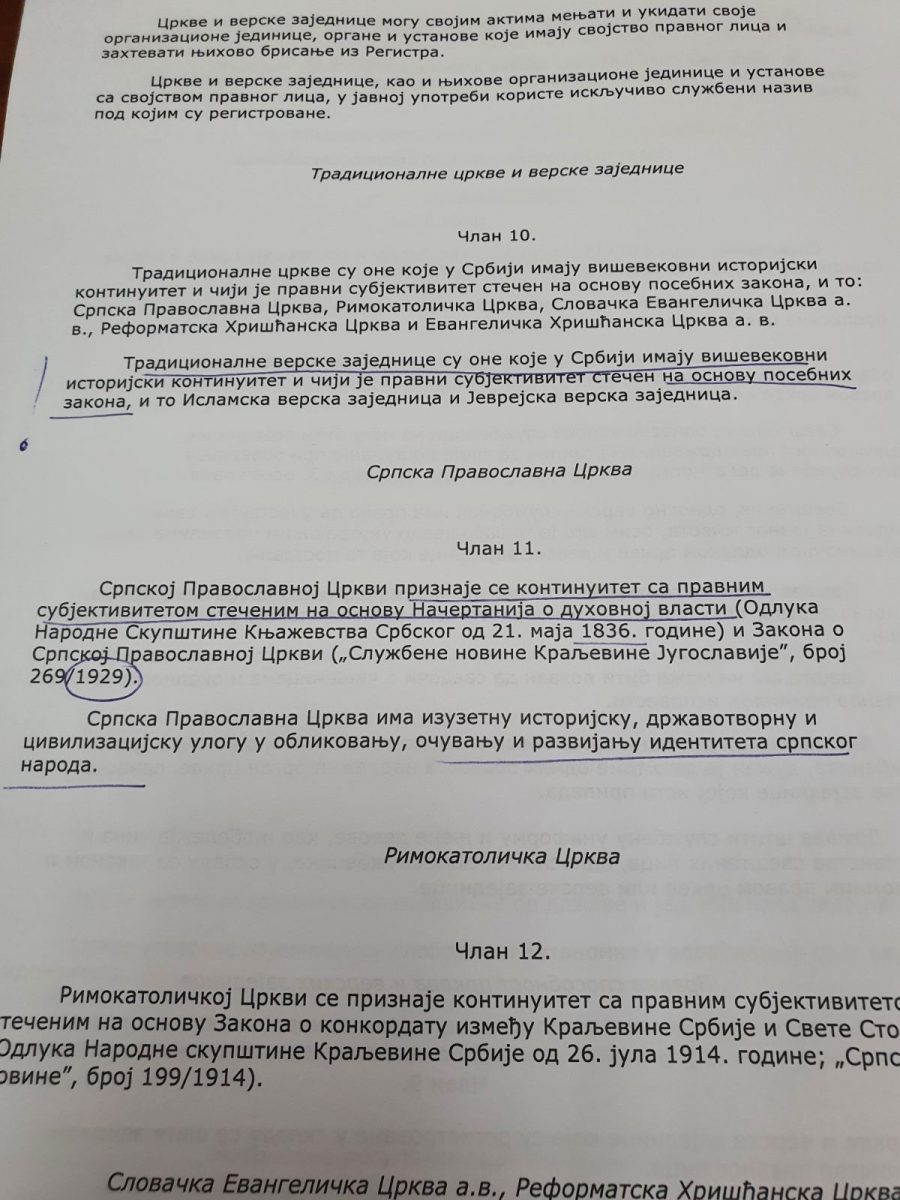 Nadalje, član 11 srpskog zakona kaže da se “Srpskoj Pravoslavnoj Crkvi priznaje kontinuitet sa pravnim subjektivitetom stečenim na osnovu Nečartanija o duhovnoj vlasti (Odluka Narodne Skupštine Knjaževstva Srbskog od 21. maja 1836. godine) i zakona o Srpskoj Pravoslavnoj Crkvi. Srpska Pravoslavna Crkva ima izuzetnu istorijsku i civilizacijsku ulogu u OBLIKOVANJU, OČUVANJU I RAZVIJANJU IDENTITETA SRPSKOG NARODA“. Jasno je, kada uzmemo u obzir napisano, da SPC u CG nema nikakvog viševjekovnog kontinutieta, te da ne može biti “tradicionalna” crkva.