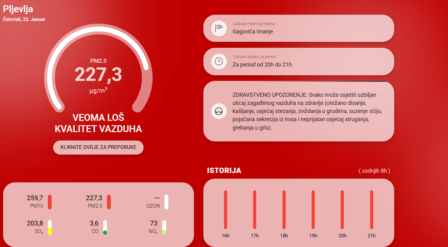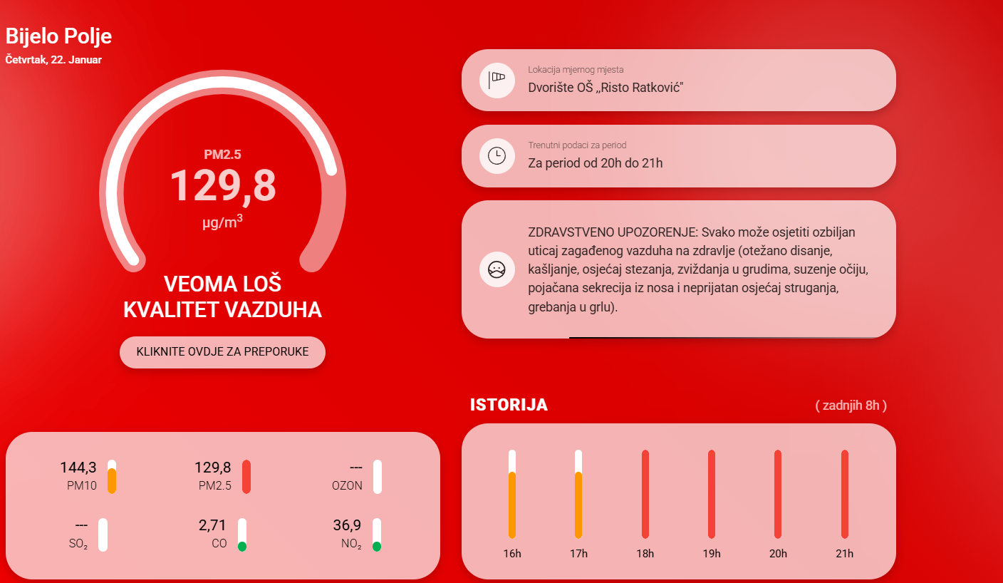 „Prekoračenja emisija PM čestica u odnosu na zakonom dozvoljene limite, po svim relevantnim zdravstvenim i evropskim standardima, predstavljaju pragove kod kojih se, prema naučnim dokazima, rizik od zdravstvenih posljedica značajno povećava. Riječ je o nivoima zagađenja koji višestruko premašuju preporuke Svjetske zdravstvene organizacije, prema kojima 24‑časovna prosječna vrijednost za PM2.5 ne bi smjela biti veća od 15 µg/m³, a za PM10 od 45 µg/m³“, navodi Vojinović.