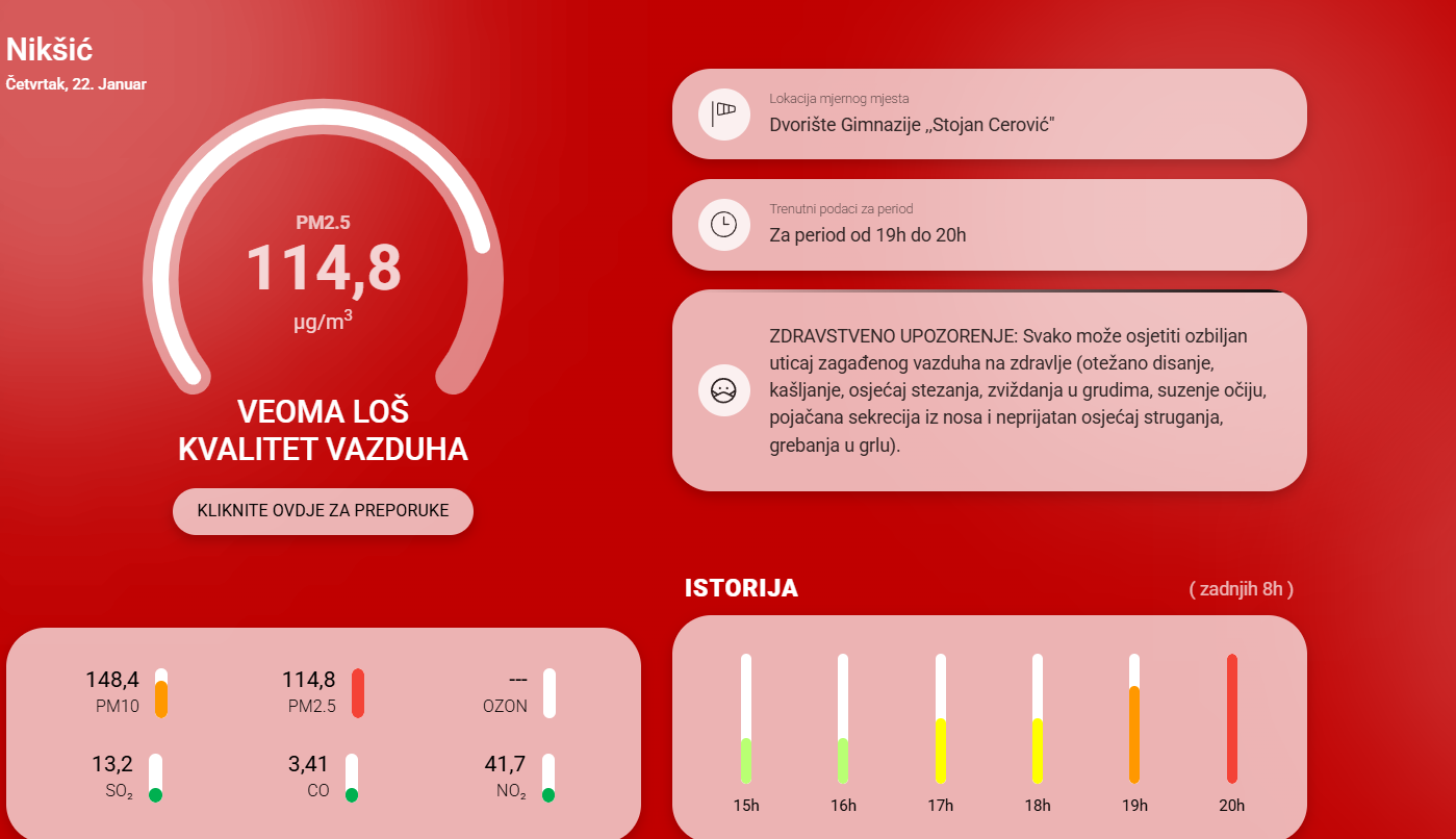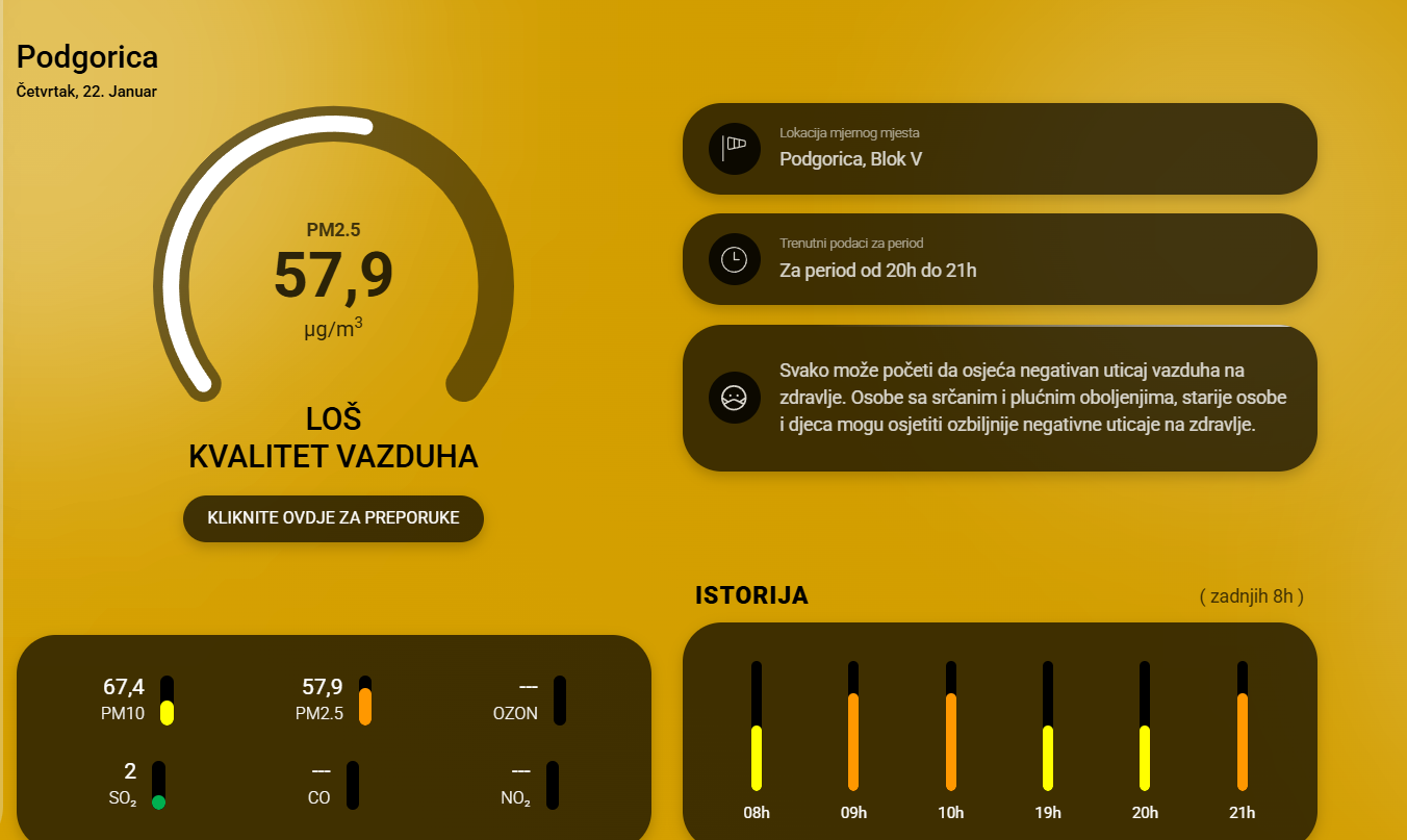 „U Crnoj Gori još od 2014. godine građani imaju uvid u mjerenja sa stanica u realnom ili gotovo realnom vremenu, a od prije dvije godine dobijaju i jasne kvalifikacije kvaliteta vazduha. Uvođenje sistema informisanja građana o kvalitetu vazduha predstavlja iskorak u transparentnosti u odnosu na period kada takvih podataka uopšte nije bilo ili kada su bili teško dostupni. Međutim, moglo bi se reći da isključivo informisanje o kvalitetu vazduha, bez istovremenog preduzimanja konkretnih zaštitnih mjera, u suštini svodi problem zagađenja na statistiku“, naglasila je sagovornica portala Standard.