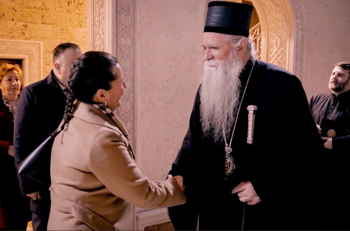 Ministarka kulture i medija Tamara Vujović rukuje se sa mitropolitom Joanikijem na božićnom prijemu u Hramu Hristovog vaskrsenja (FOTO: MKM)