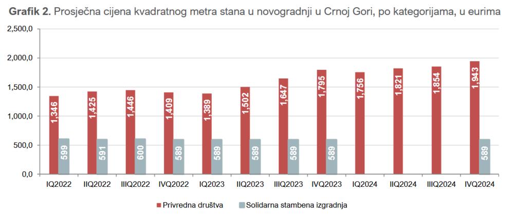 Kvadrat novogradnje koji grade sindikalni ili penzionerski solidarni stambeni fondovi kupovan je krajem prošle godine za 589 eura. Međutim njih je bilo samo u posljednjem kvartalu i tu u centralnoj regiji bez Podgorice, koja obuhvata opštine Nikšić, Cetinje, Danilovgrad, Tuzi i Zetu.