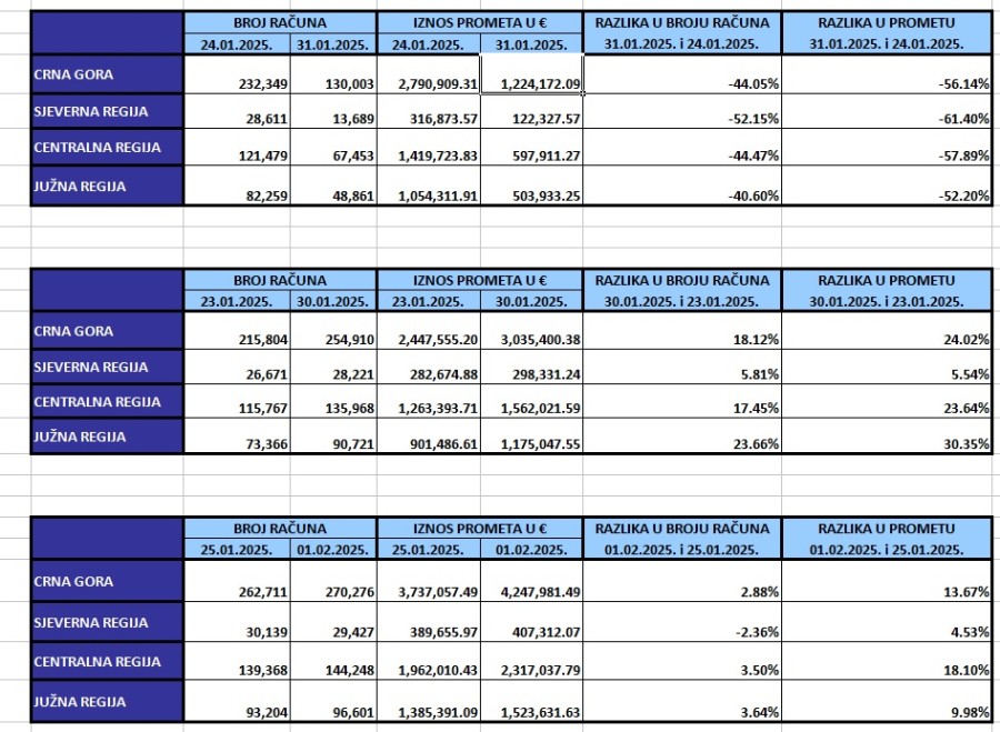 Tako je pet najvećih trgovačkih lanaca u Crnoj Gori tokom 30. januar, 31. januara i 1. februar ostvarilo promet od oko 8,5 miliona eura, od čega smo 31. januara imali bojkot prodavnica.