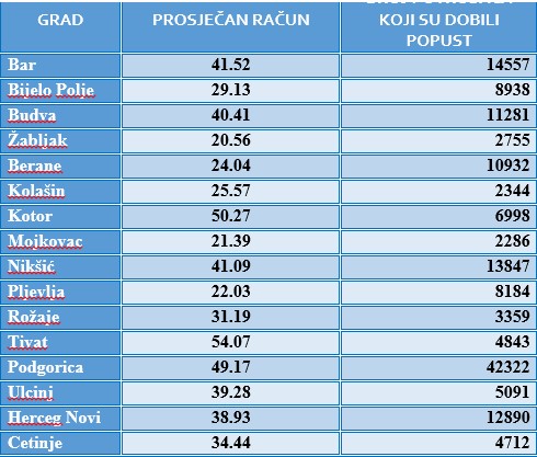 “Broj kupaca koji su dobili popust je 155,339, odnosno 38.8% odsto domaćinstava u Crnoj Gori. Takođe, 15,432 domaćinstva u Pljevljima, odlukom Odbora direktora, ostvarilo je 30 odsto popusta, u cilju smanjenja aerozagađivača, a imajući u vidu značaj energetskih subjekata RUP-a i TEP-a za elektroenergetsku stabilnost u Crnoj Gori. Dodatni popust od 6,4% na mrežne usluge odobrava se i svim domaćinstvima priključenim na elektrodistributivni sistem EPCG, bez obzira na visinu duga, radi neutralisanja rasta cijena mrežnih usluga”, dodaju iz EPCG.