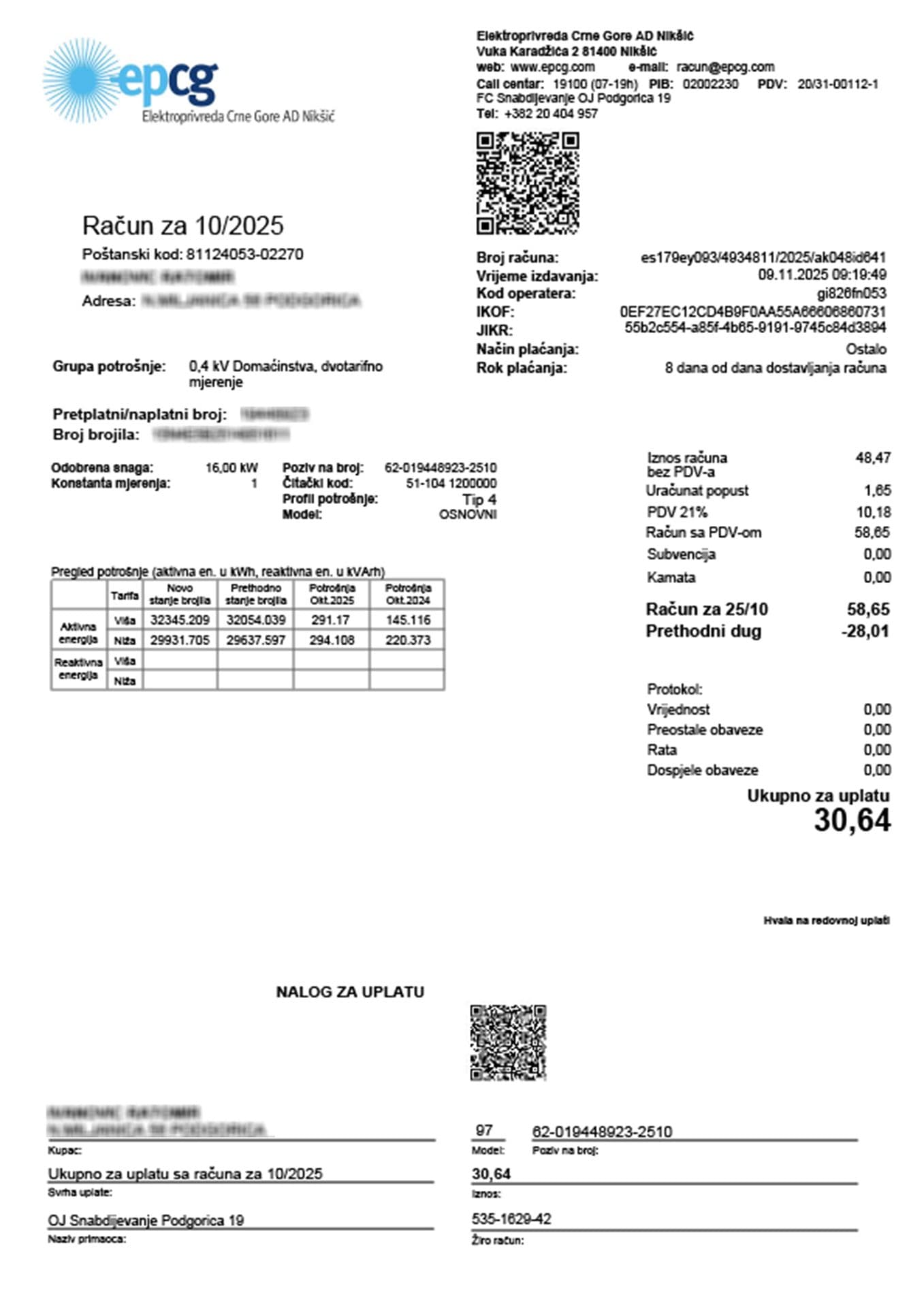 “Prosječan račun za decembar prošle godine iznosio je 46,75 eura na nivou Crne Gore, odnosno 57,57 eura na nivou Podgorice. Najnižu prosječnu potrošnju u decembru imali su kupci sa Žabljaka (20,48 eura), a najveću kupci iz Tivta (59,50 eura). Prosječan račun za novembar 2025. godine iznosio je 36,35 eura na nivou Crne Gore, odnosno 42,78 eura na nivou Podgorice. Najnižu prosječnu potrošnju u novembru 2025. godine imali su kupci sa Žabljaka (20,35 eura), a najveću kupci iz Tivta (46,62 eura)”, precizirali su iz EPCG.