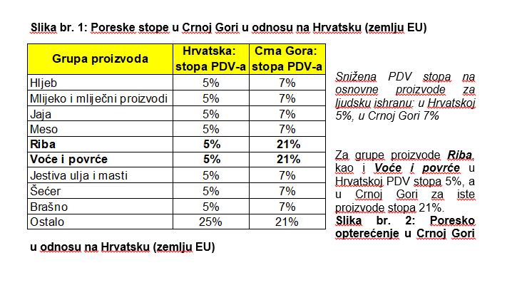 Za grupe proizvode Riba, kao i Voće i povrće u Hrvatskoj PDV stopa pet odsto, a u Crnoj Gori za iste proizvode stopa 21 odsto.