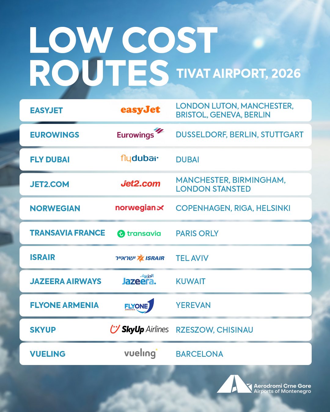 Prema najavama avio-kompanija, niskotarifni (low-cost i OW-cost) prevoznici će tokom ljeta povezivati crnogorske aerodrome sa brojnim evropskim gradovima, omogućavajući putovanja po znatno nižim cijenama u odnosu na tradicionalne avio-linije.