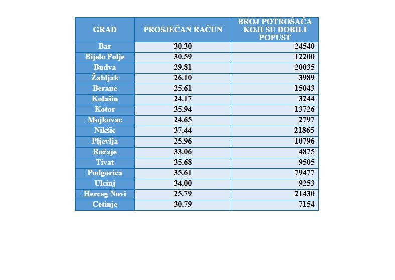 “Broj potrošača koji su ostvarili popust od 38 odsto na aktivnu energiju iznosi 157.163, što predstavlja 38.53 odsto domaćinstava u Crnoj Gori. 49.934 potrošača, odnosno 12.24 odsto, ostvarilo je popust od 21,5 odsto takođe na aktivnu energiju. Pored toga, 207,097 potrošača, odnosno 50.75 odsto, ostvarilo je dodatni popust od 6,4 odsto na mrežne usluge”, zaključili su.