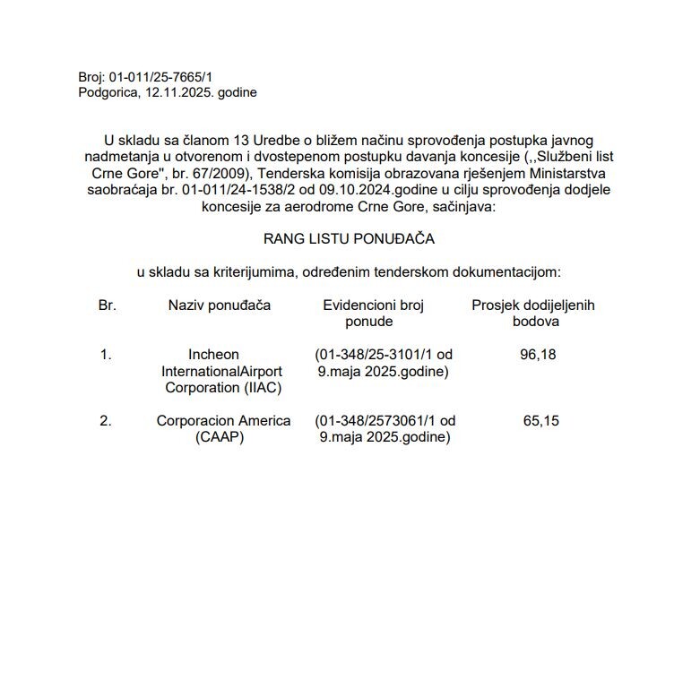 “Ova rang lista objavljuje se nakon izvršenih korekcija Izvještaja o sprovedenom postupku vrjednovanja ponuda sa rang listom ponuđača i obrazloženjem rang liste, u skladu sa Rješenjem Komisije za koncesije broj 01/97 od 1. septembra. Shodno članu 42 stav 3 Zakona o koncesijama (Službeni list CG”, broj 8/09) ponudač ima pravo da u roku od 15 dana od dana objavljivanja Rang liste ponudača podnese prigovor Komisiji za koncesije Vlade Crne Gore. Takođe, shodno članu 31 stav 2 Zakona o koncesijama, ponudač ima pravo da u roku od osam dana od dana objavljivanja Rang liste ponudača na pisani zahtjev izvrši uvid u dokumentaciju iz člana 30 stav 2 ovog Zakona”, navodi Ministarstvo saobraćaja.Preporučeno